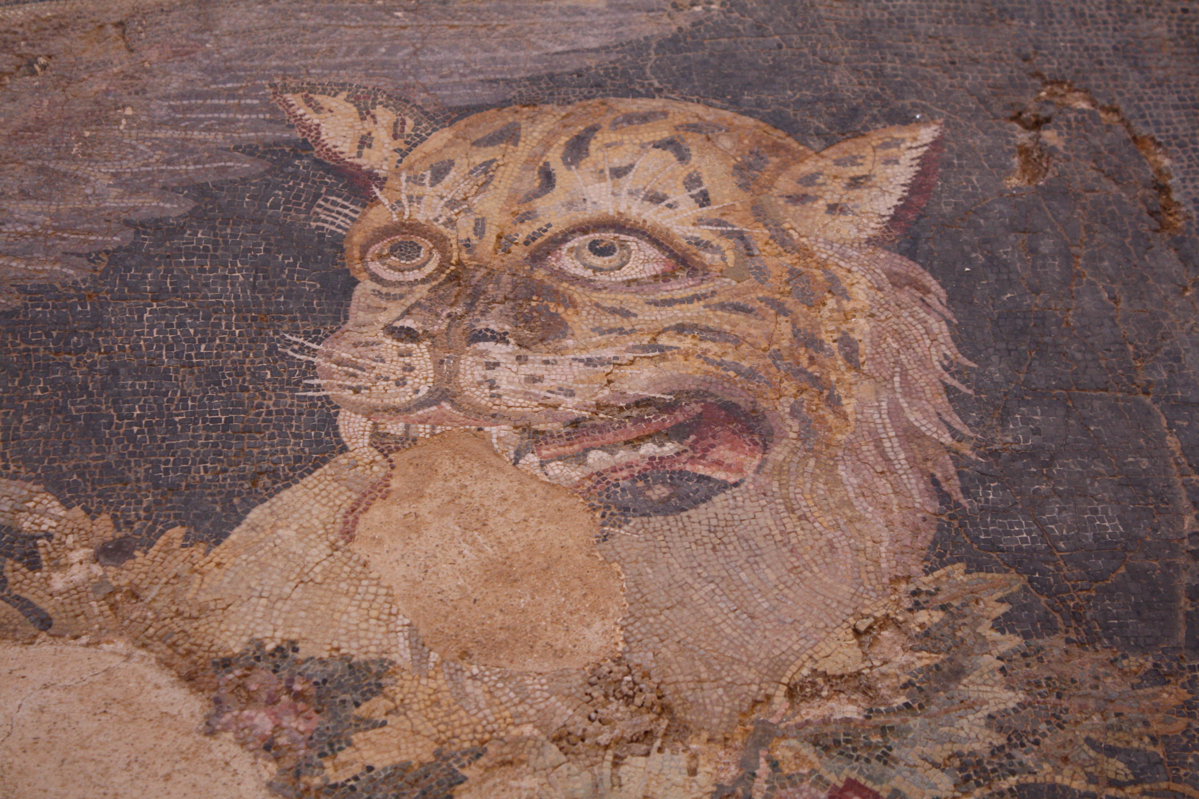 A detail showing the tiger from the Dionysos Mosaic emblemata which depicts the god riding the animal. From the House of Dionysos, Delos. (Hellenistic Period).