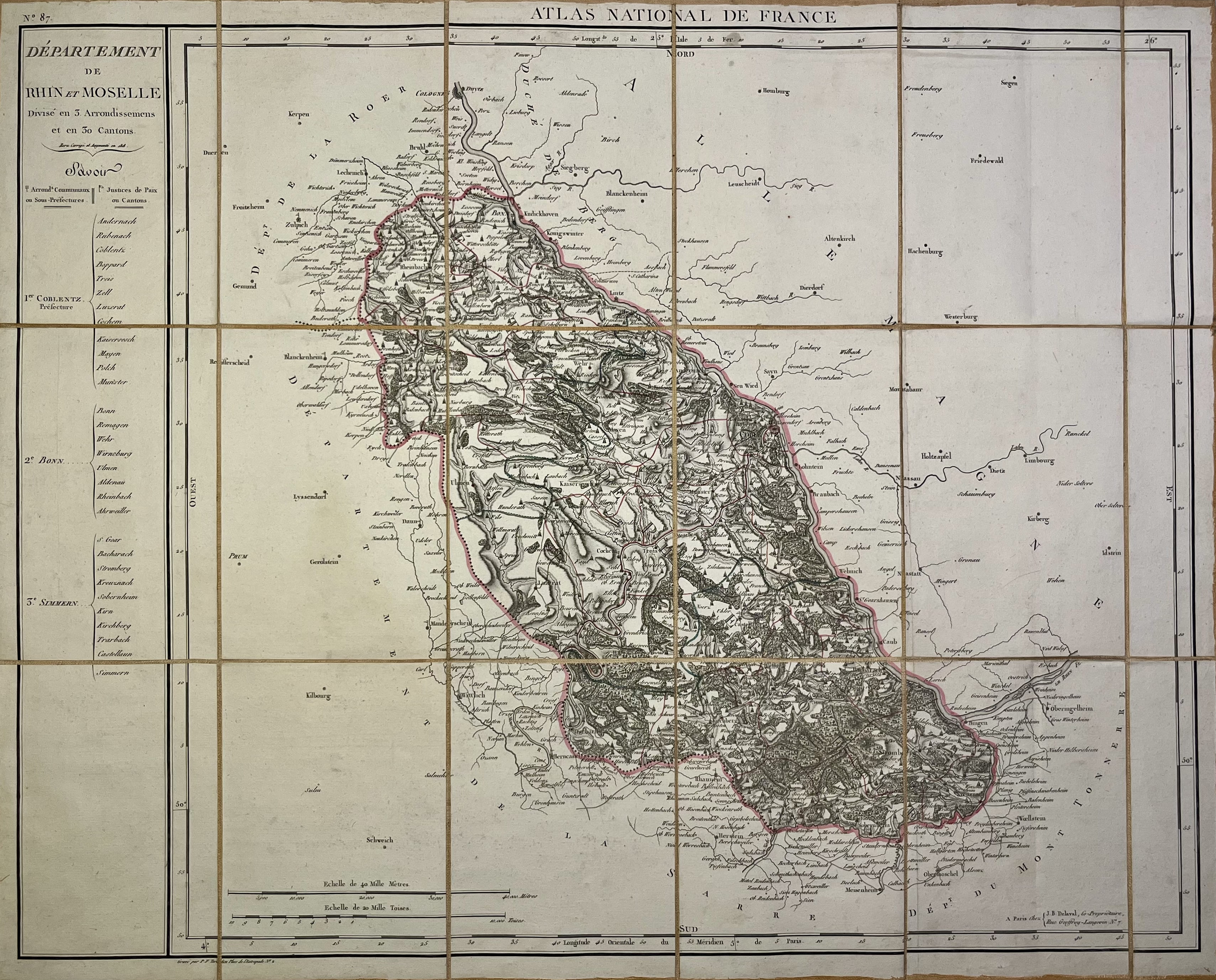 This antique map of Germany represents the department of Rhin-et-Moselle under the First French Empire. It was produced in the early 19th century by French geographer Pierre-Gilles Chanlaire and is included in the Atlas National de France. The map reflects the administrative restructuring of the region following its incorporation into the Napoleonic Empire.