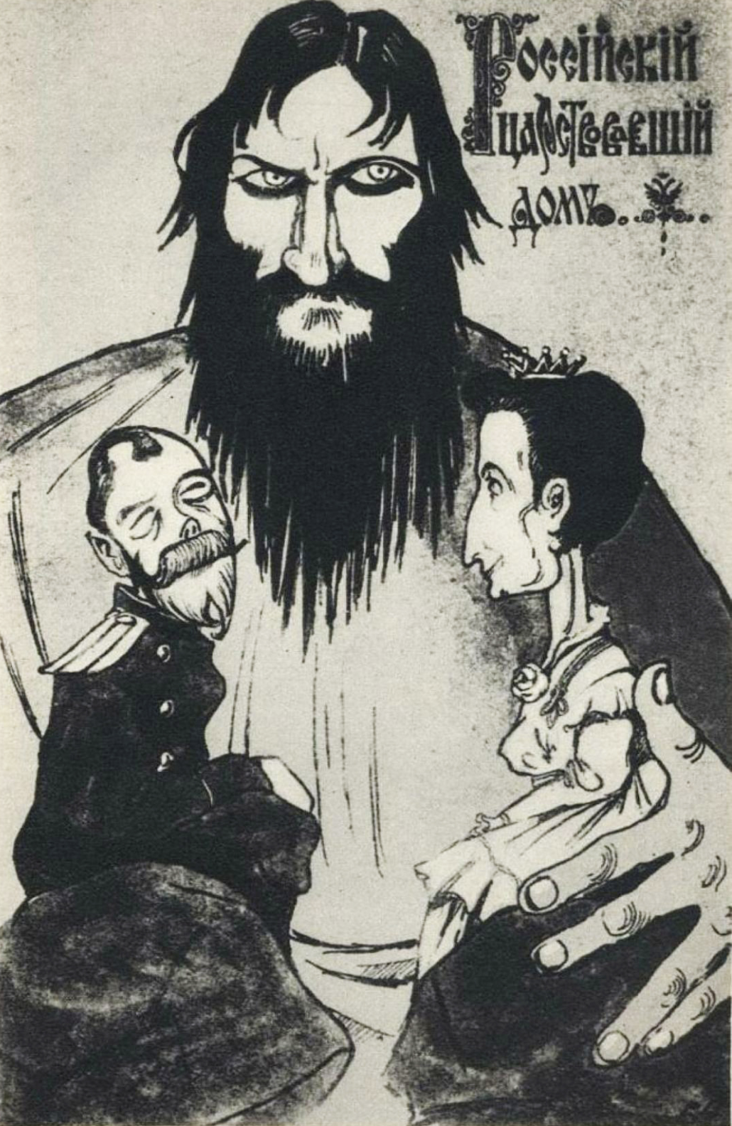 A c. 1916 cartoon showing the Russian self-styled monk and faith healer Grigori Rasputin (1869-1916) who gained influence over the family of Tsar Nicholas II (reign 1894-1917) and his wife Empress Alexandra Feodorovna (1872-1918). The Russian press printed scandalous stories about Rasputin and ridiculed what was considered his excessive influence over the royal family, particularly during the First World War (1914-18).