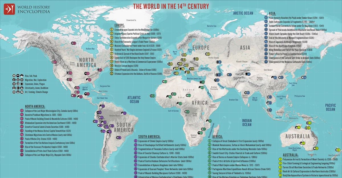 The 14th century was a time of crisis and transformation across much of the world. Plague, war, shifting power structures, and intellectual ferment reshaped societies from Asia to Africa, Europe to the Americas. Despite profound instability, new centers of influence emerged and long-distance connections intensified, forging an increasingly intertwined—yet fractured—global landscape.