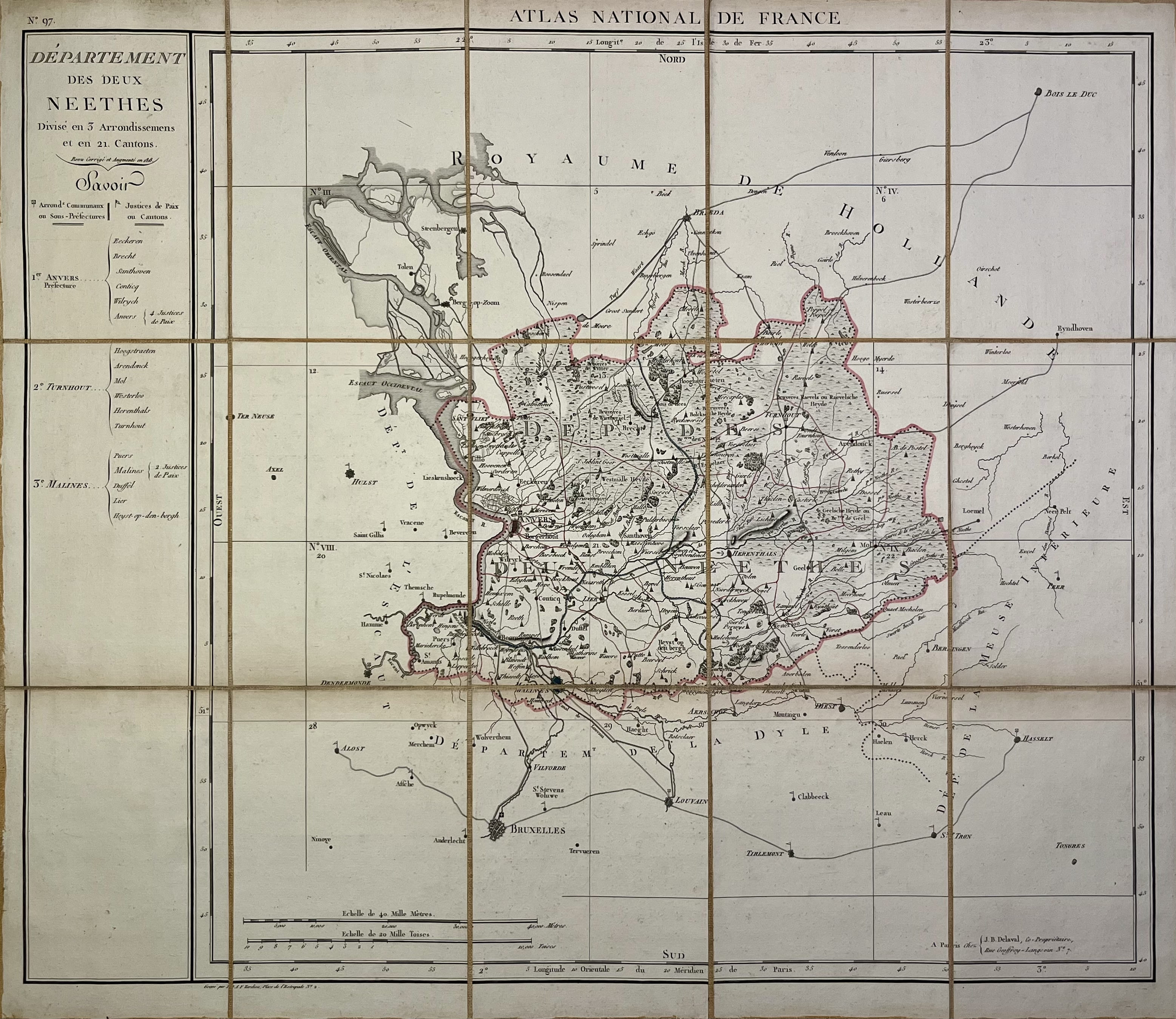 This antique map of Belgium depicts the Deux-Nèthes department under the First French Empire. It was created in the early 19th century by French geographer Pierre-Gilles Chanlaire and is part of the Atlas National de France. The map reflects the Napoleonic reorganization of Belgian territories during the imperial annexation.