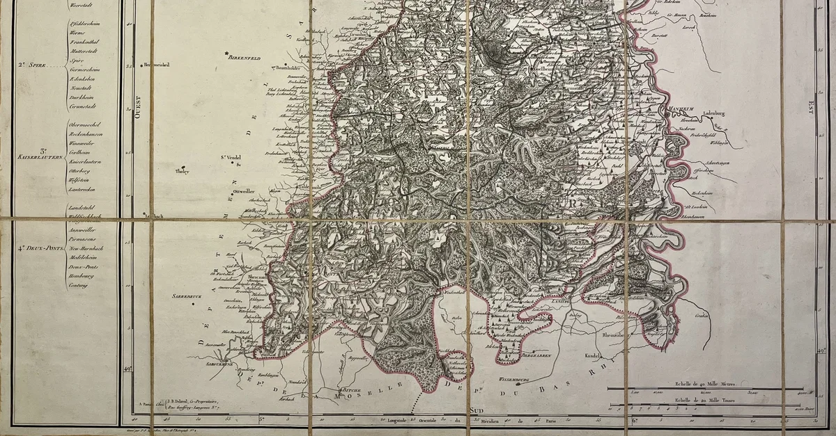 This antique map of Germany represents the Mont-Tonnerre department under the First French Empire. It was produced in the early 19th century by French geographer Pierre-Gilles Chanlaire and is part of the Atlas National de France. The map documents the administrative reorganization of western German territories during the Napoleonic era.