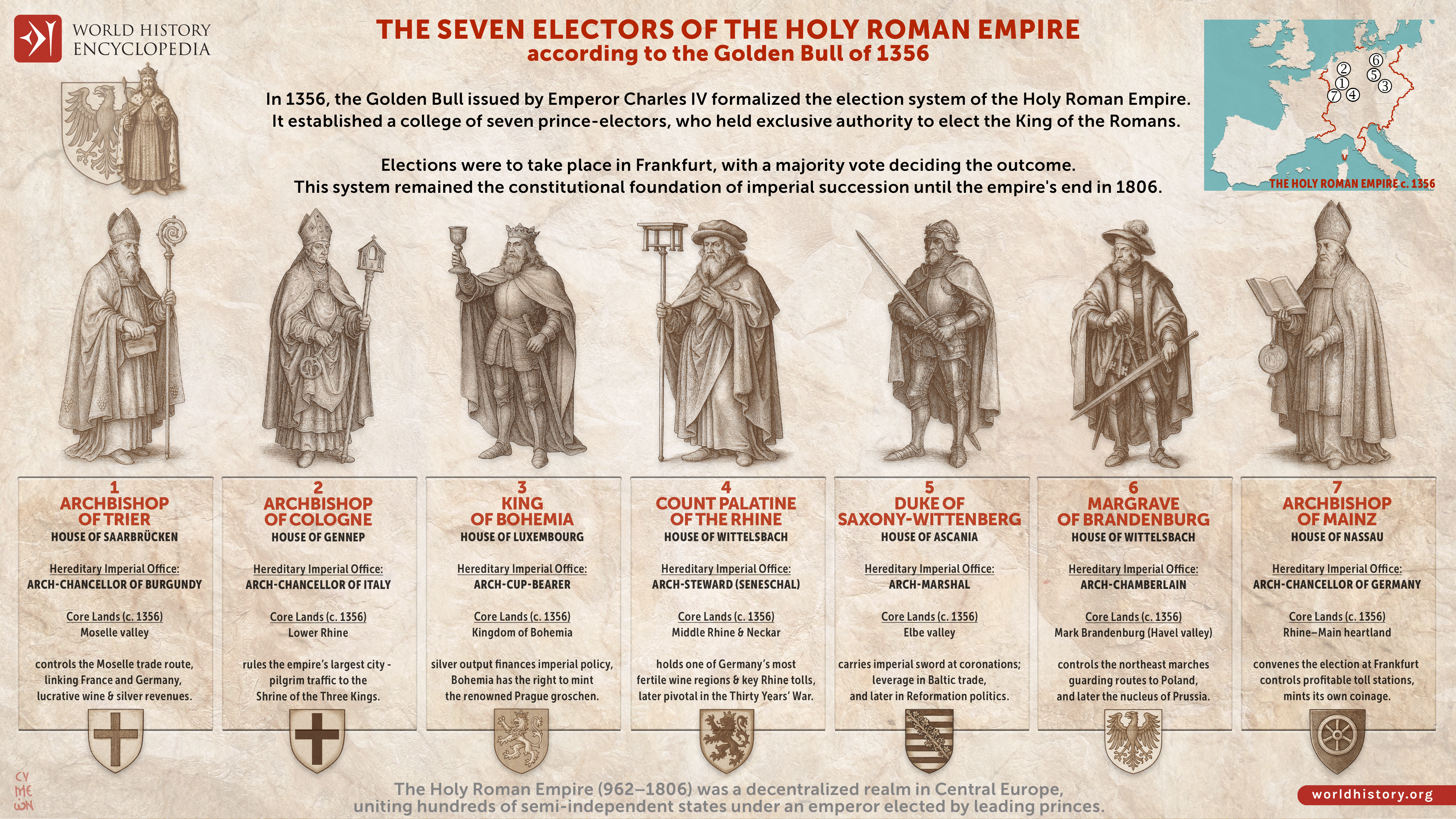 The role of the Electors was formally codified in the Golden Bull of 1356, issued by Emperor Charles IV (reign 1346–1378). This landmark decree established seven electors: three ecclesiastical rulers: the Archbishops of Mainz, Trier, and Cologne, and four secular princes: the King of Bohemia, the Count Palatine of the Rhine, the Duke of Saxony, and the Margrave of Brandenburg. Chosen for their territorial strength and strategic importance, the Electors shaped imperial succession and policy, balancing the authority of the emperor against the autonomy of the empire’s constituent states.