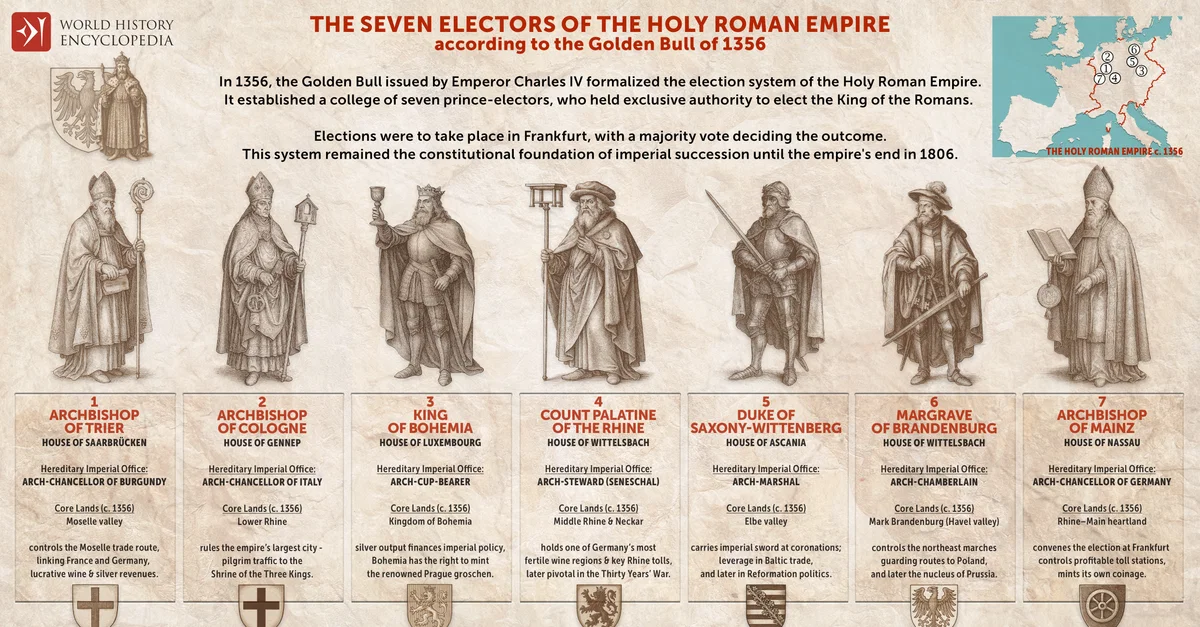 The Holy Roman Empire (962–1806) functioned as a decentralized political system in Central Europe, where imperial authority depended less on centralized power than on negotiation among its leading elites. Central to this structure were the Electors, a select group of princes and archbishops who held the exclusive right to choose the emperor. This electoral system reflected the empire’s character as a federation of semi-autonomous territories, seeking stability through consensus rather than absolute monarchy.