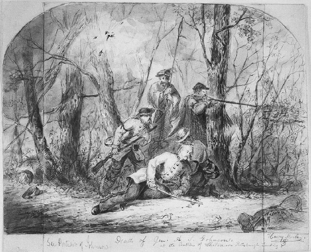 The death of Confederate General Albert Sidney Johnston (1803-1862) at the Battle of Shiloh, 6 April 1862. By Henry Mosler, 1862.
