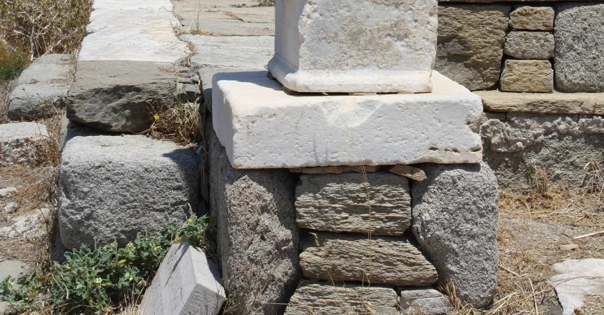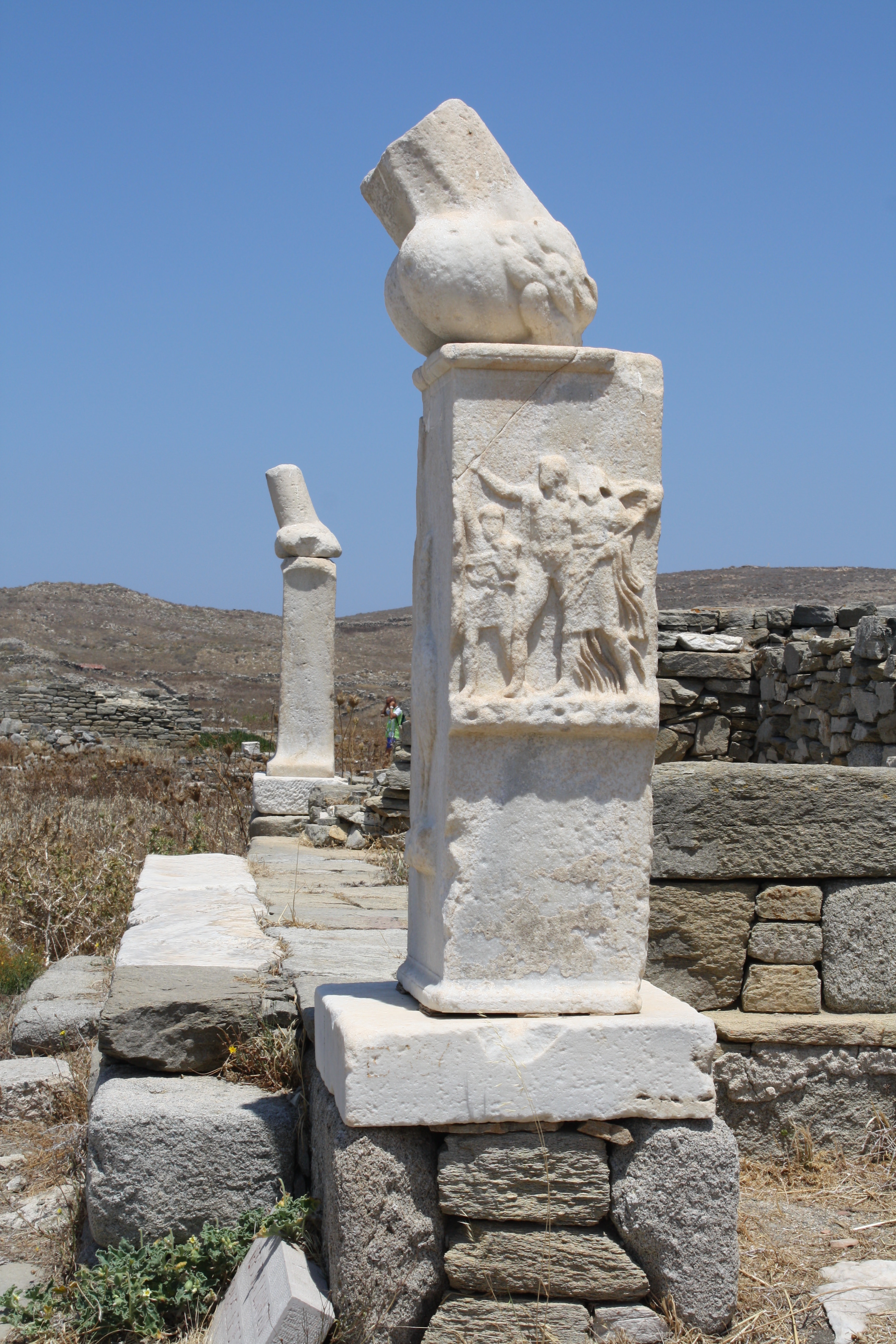 Two columns topped by a phallus, each carrying relief scenes of Dionysos and Pan, c. 300 BCE. The phallus was a typical symbol of the cult of Dionysos. They stand as part of the Stoivadeion, a rectangular exedra.