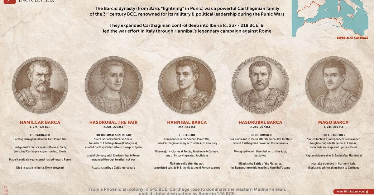 This infographic illustrates the rise and influence of the Barcid Dynasty, a powerful Carthaginian family that shaped Carthage’s military and political strategy during the third century BCE. Active from circa 260 to 200 BCE, the Barcids played a central role in Carthage’s expansion into Iberia and its confrontation with Rome during the First and Second Punic Wars.