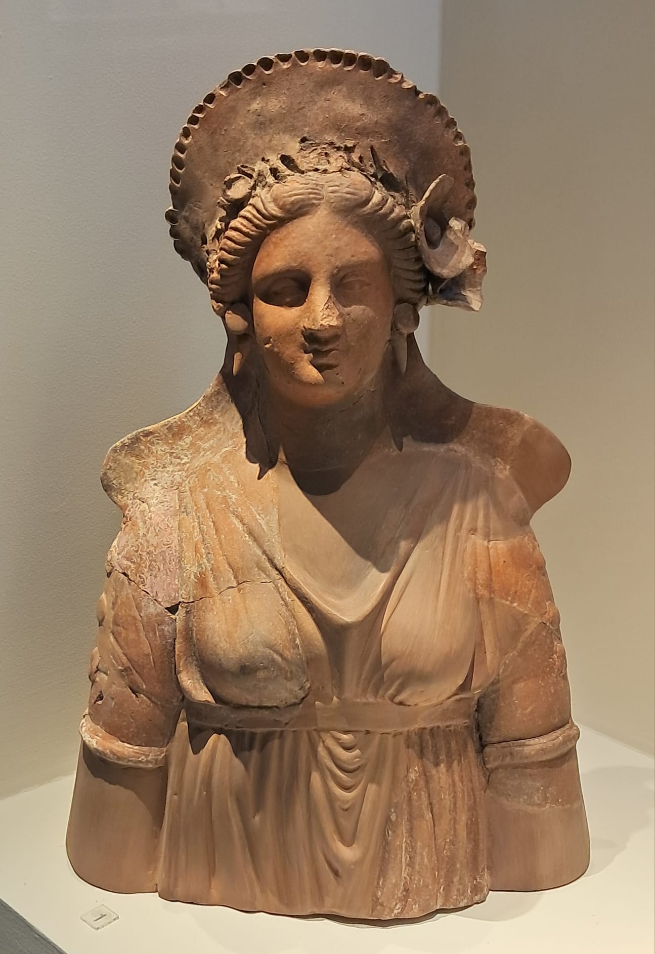 Terracotta bust of a maiden wearing a high-profile crown, from Pella, c. 320-300 BCE.