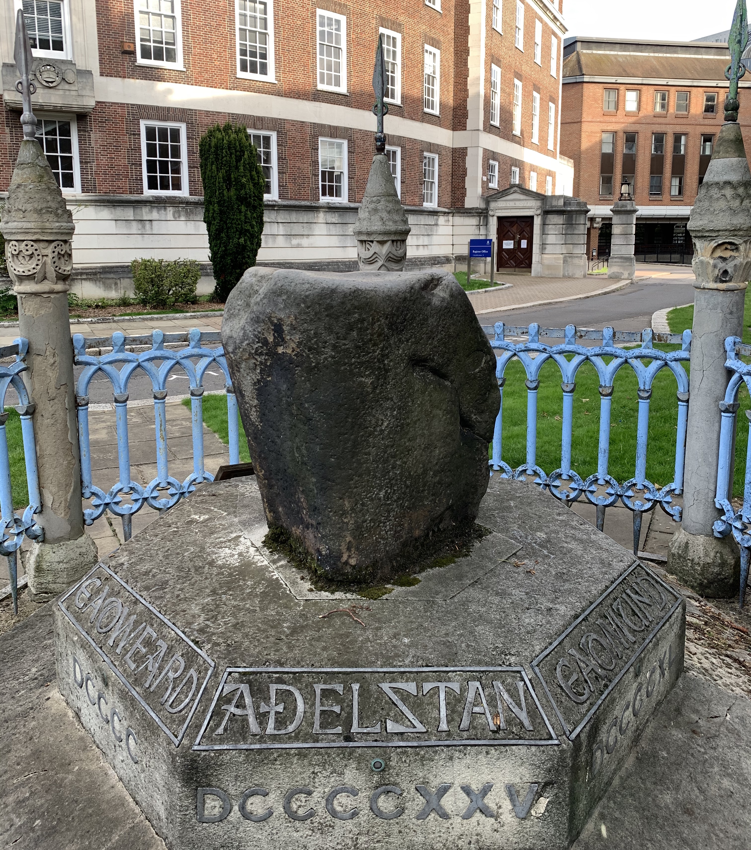 The Coronation Stone is an ancient sarsen stone block recording the coronations of seven Anglo-Saxon kings: Edward the Elder, Aethelstan, Edmund I, Eadred, Eadwig the Fair, Edward the Martyr and Aethelred the Unready, at Kingston-upon-Thames.