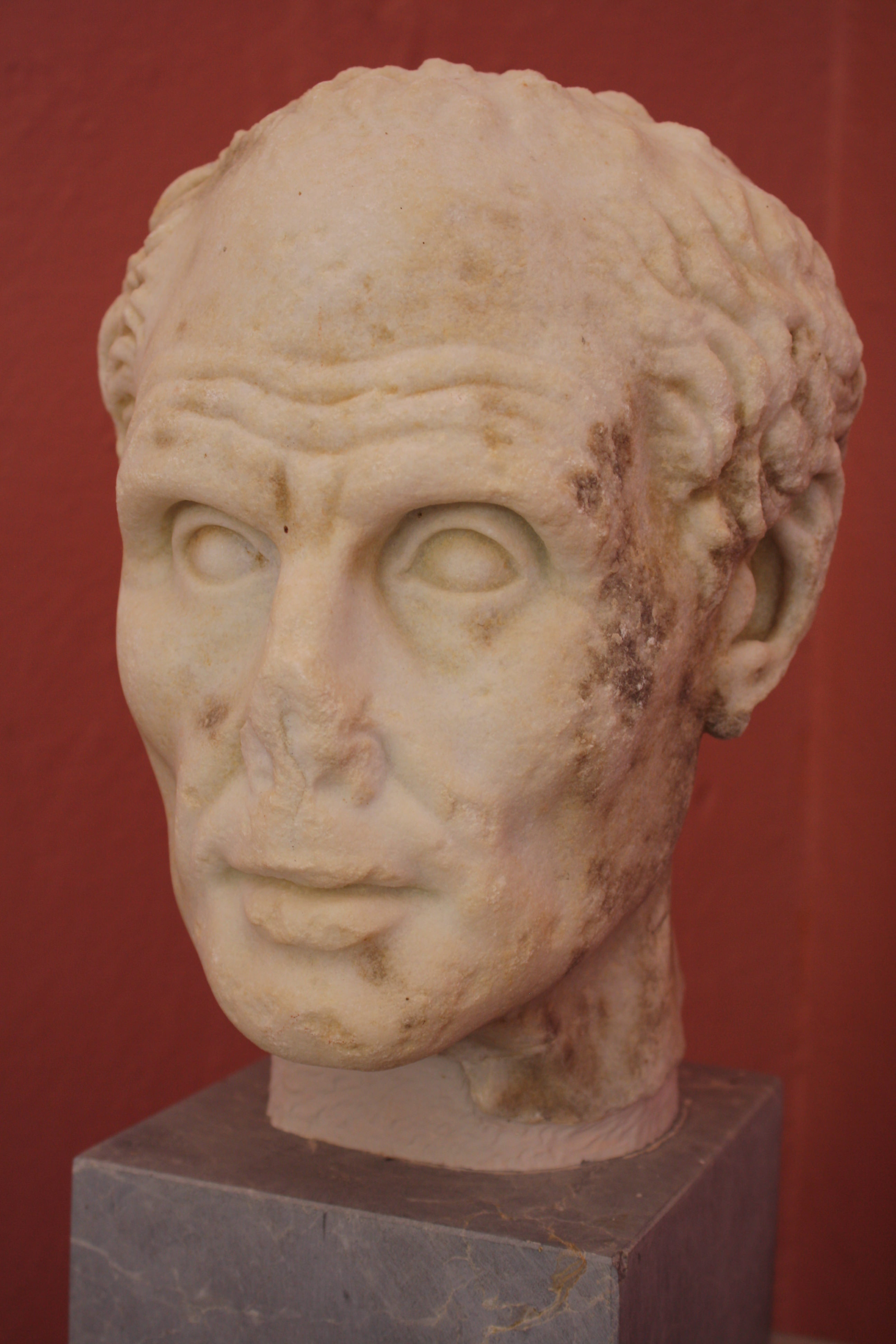 A roman portrait bust of an unknown man, 2nd century BCE. From the palaestra of Delos. The bust is a typical example of the sometimes unflattering realism of Roman portraiture.