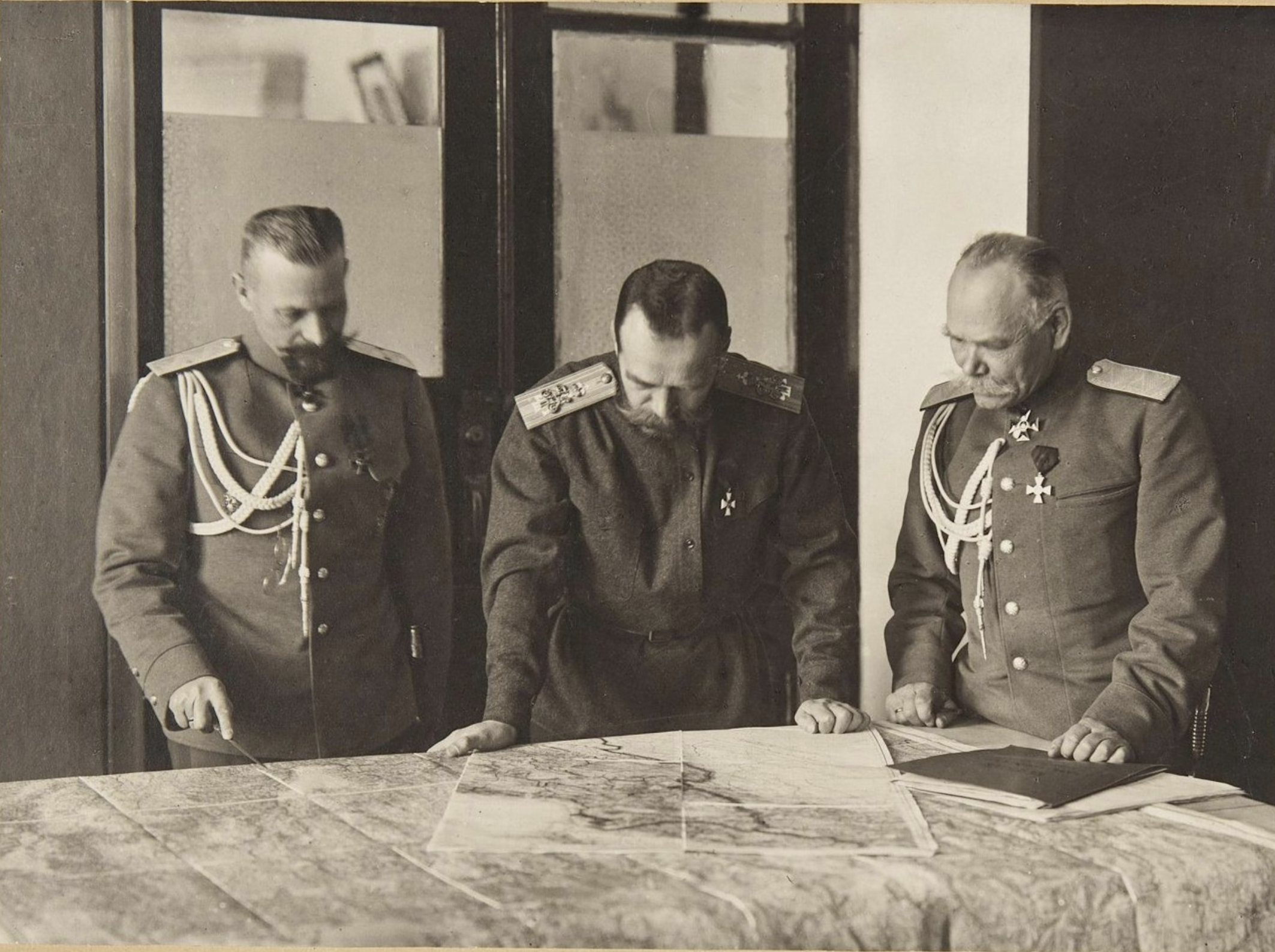 A 1915 photograph of Tsar Nicholas II (reign 1894-1917), shown in the centre, in his role as Commander-in-Chief of the armed forces of the Russian Empire during the First World War (1914-18).
