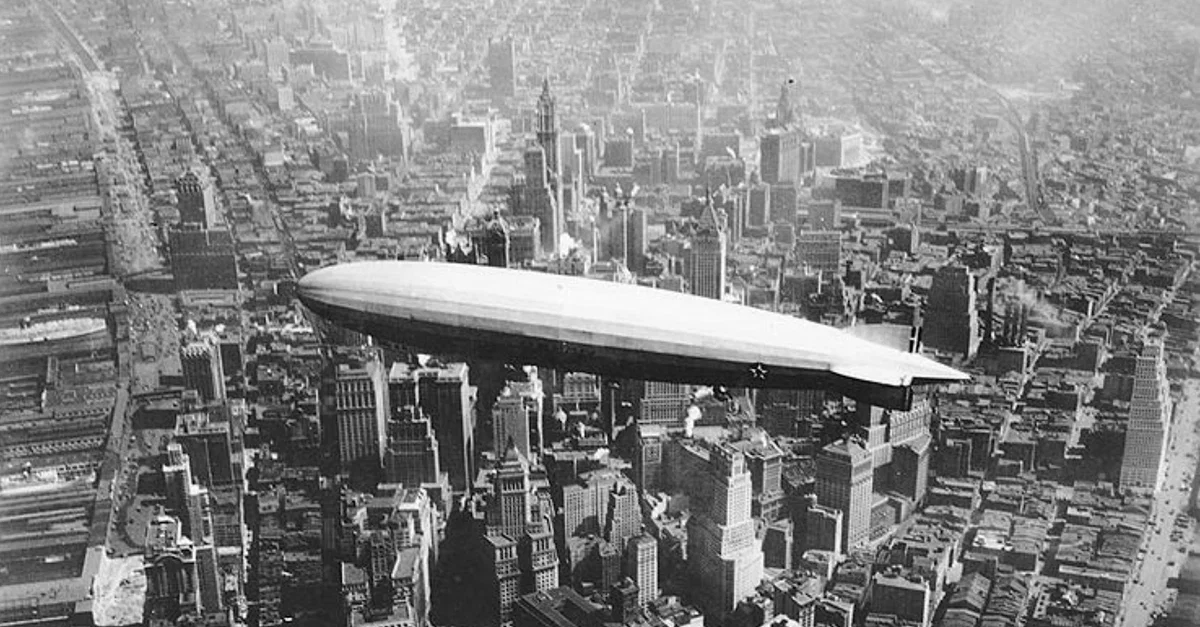 The Zeppelin airship USS Los Angeles (formerly LZ 126) flying over Manhattan, New York, circa 1924-1932. The Los Angeles was acquired by the United States Navy for experimental use.