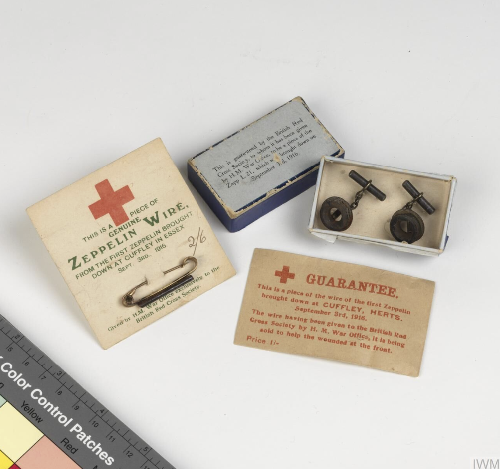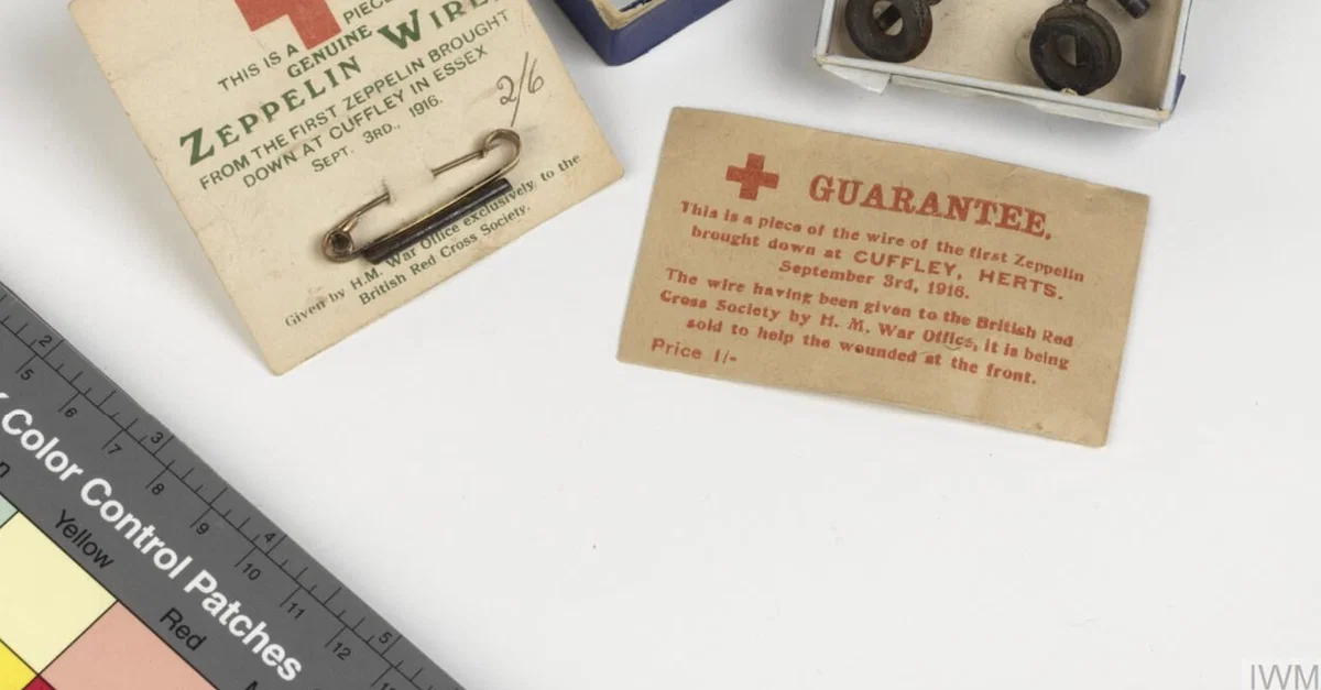 Articles which were on sale in Britain during the First World War (1914-18) to raise funds for the Red Cross. The articles are made from pieces of the metal frame of a shot down Zeppelin airship. (Imperial War Museums)