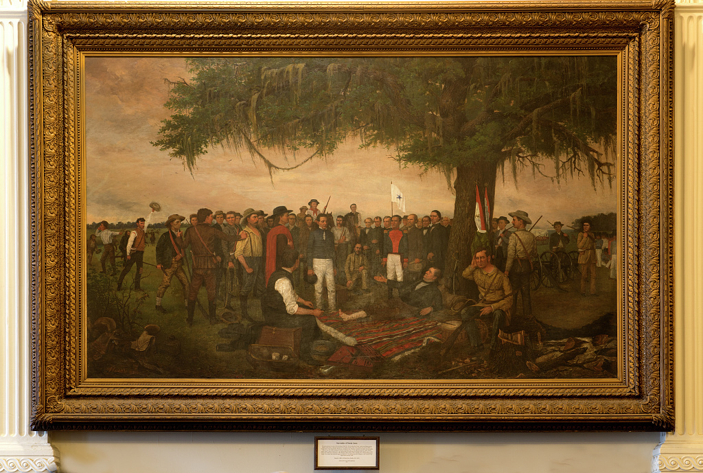 Mexican General Antonio López de Santa Anna surrenders to Sam Houston's Texian force after the Battle of San Jacinto (21 April 1836), securing Texas' independence. Painting by William Henry Huddle, 1886; in the Texas State Capitol, Austin.