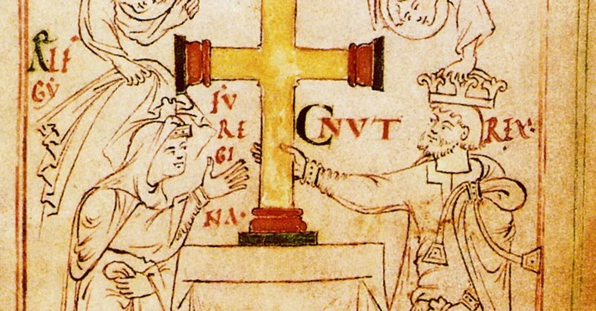 A contemporary illustration of Cnut the Great and Emma of Normandy donating a cross to the New Minster in Winchester, England. Queen Emma is listed by her English name, Aelfgifu (not to be confused with Cnut's first wife, Aelfgifu of Northampton). From the New Minster Liber Vitae, Stowe MS 944, f. 6.