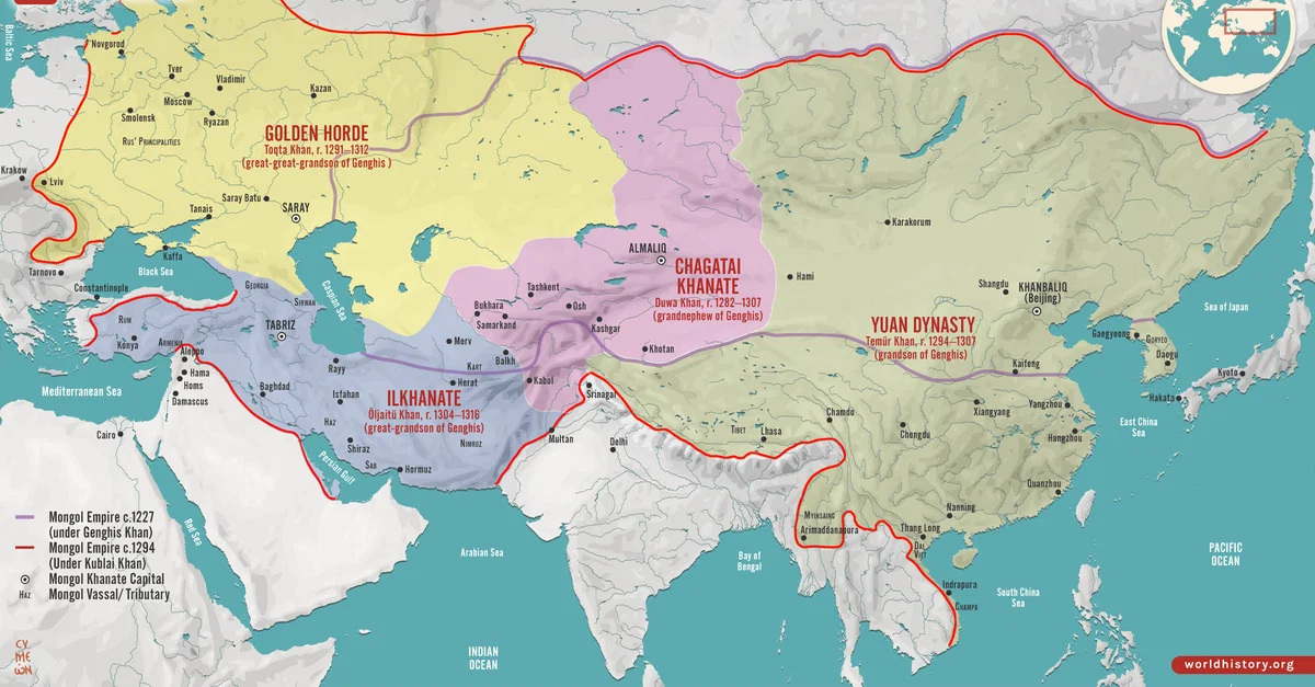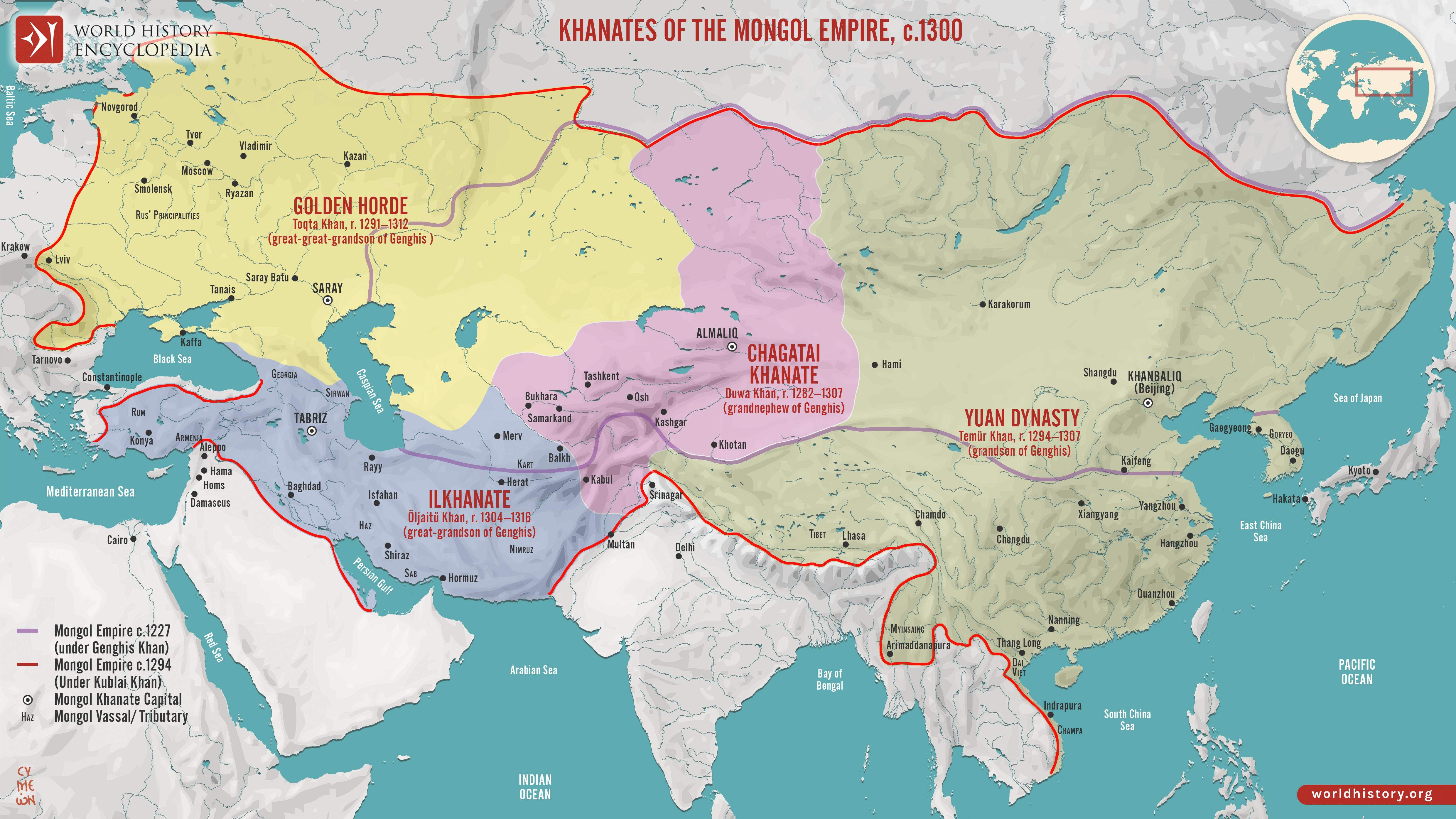 Netchev, S. (2025, July 15). Map of the Four Khanates of the Mongol Empire, c. 1300. World History Encyclopedia. https://www.worldhistory.org/image/20677/map-of-the-four-khanates-of-the-mongol-empire-c-13/