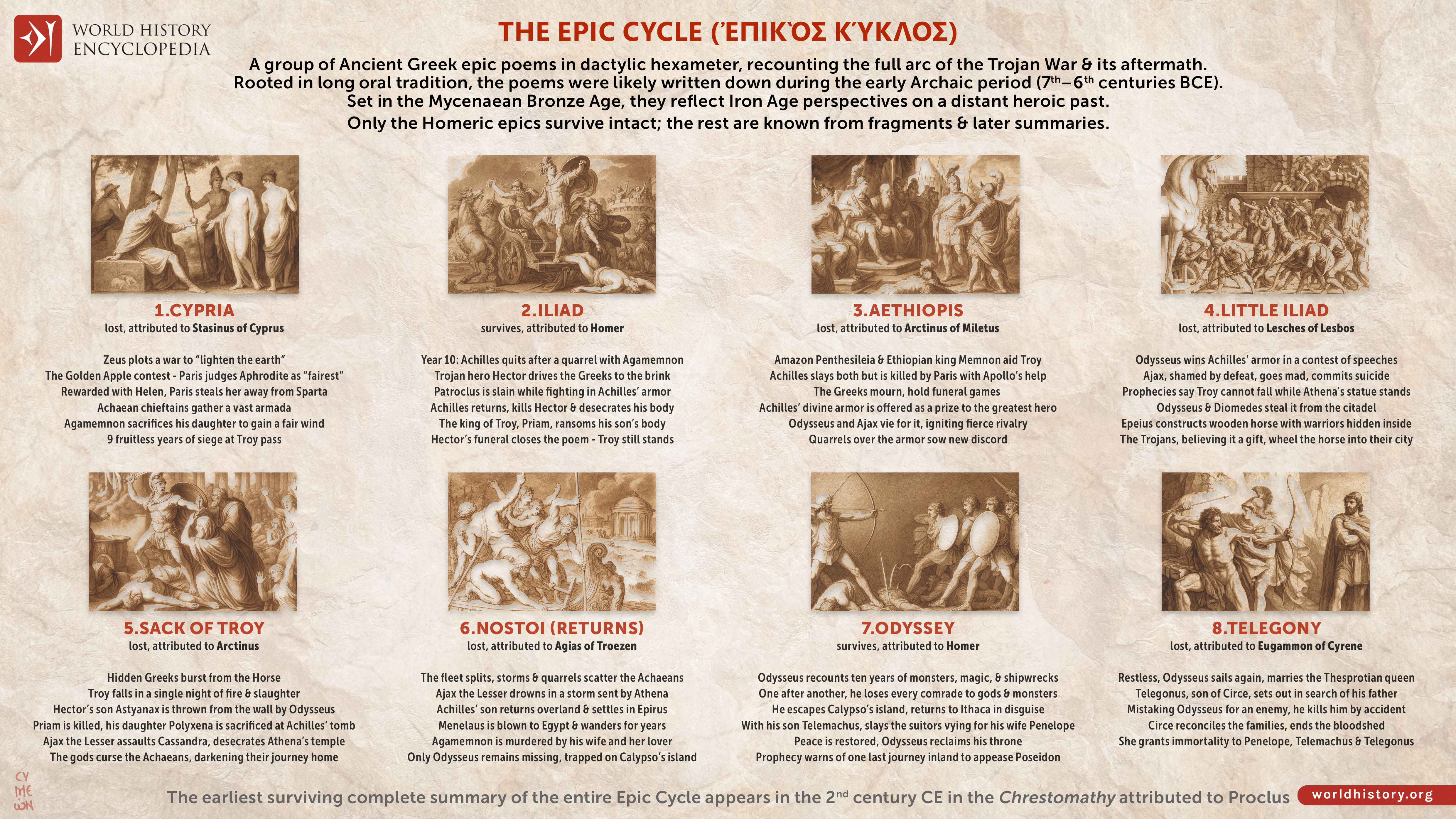 This infographic illustrates the Epic Cycle (Ἐπικὸς Κύκλος), a lost collection of ancient Greek epic poems that once narrated the full arc of the Trojan War and its aftermath, from the origins of the conflict to the heroes' returns. Though only fragments survive today, the Cycle was once seen as a comprehensive mytho-historical narrative surrounding Troy.