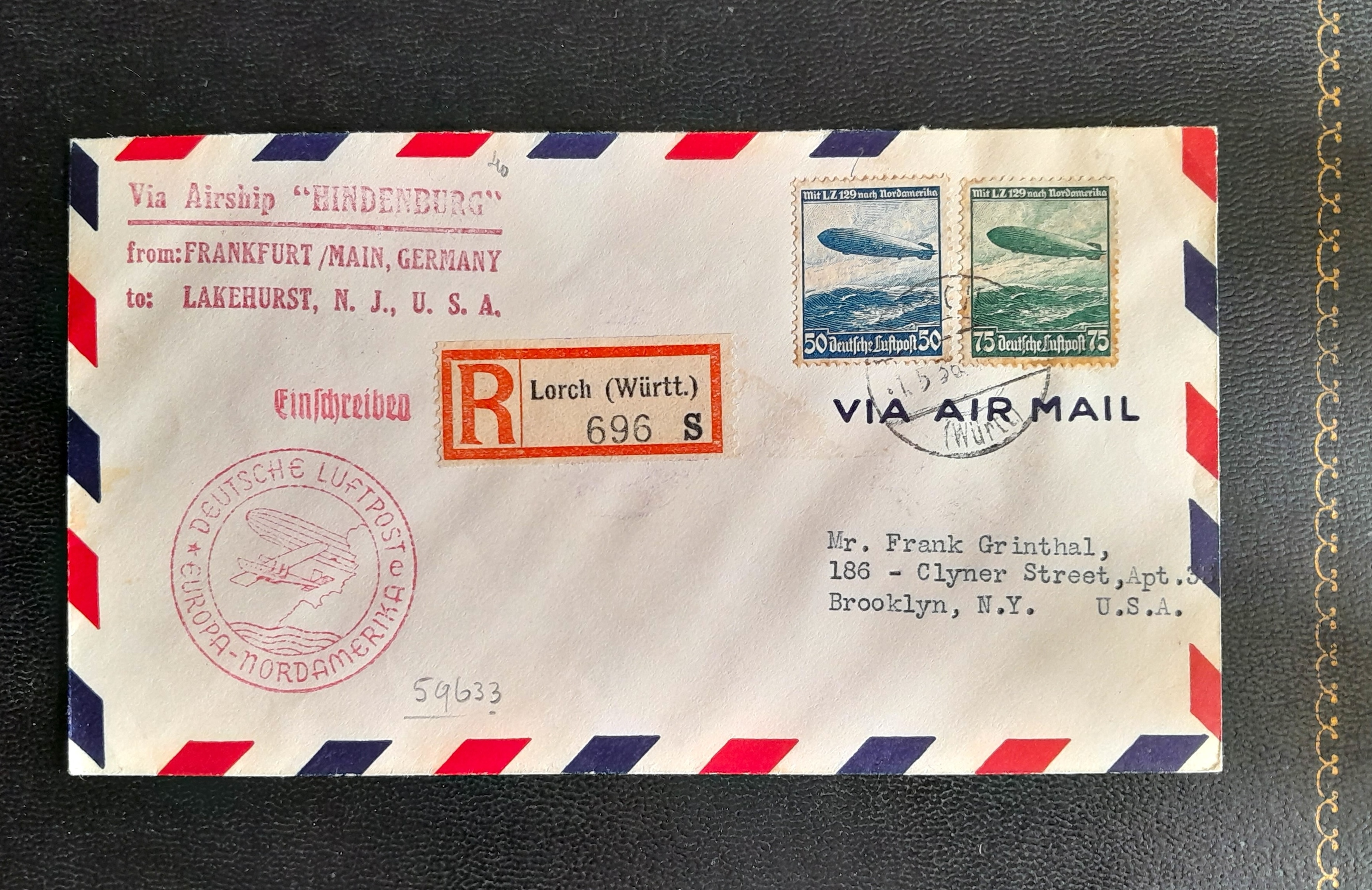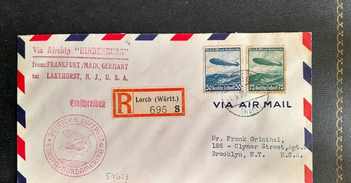 A letter carried by the Zeppelin airship LZ 129 Hindenburg. The transatlantic zeppelins offered a postal service to their passengers. This letter was carried on the Hindenburg's first crossing to New York in May 1936. The postage stamps were issued in Germany in 1936 and show the Hindenburg. (Private Collection)
