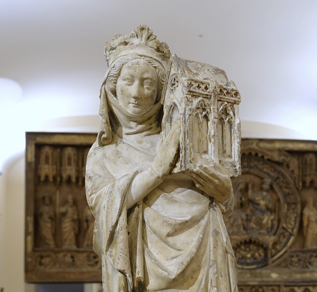 A detail of a statue of Joan I of Navarre who served as queen of Navarre and countess of Champagne and Brie between 1274 and 1305. The statue represents Joan in her capacity as benefactress having founded the college of Navarre at the University of Paris.