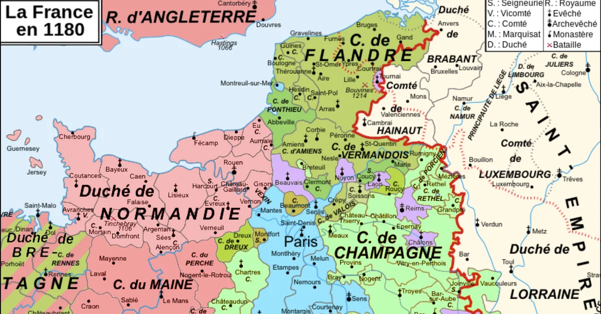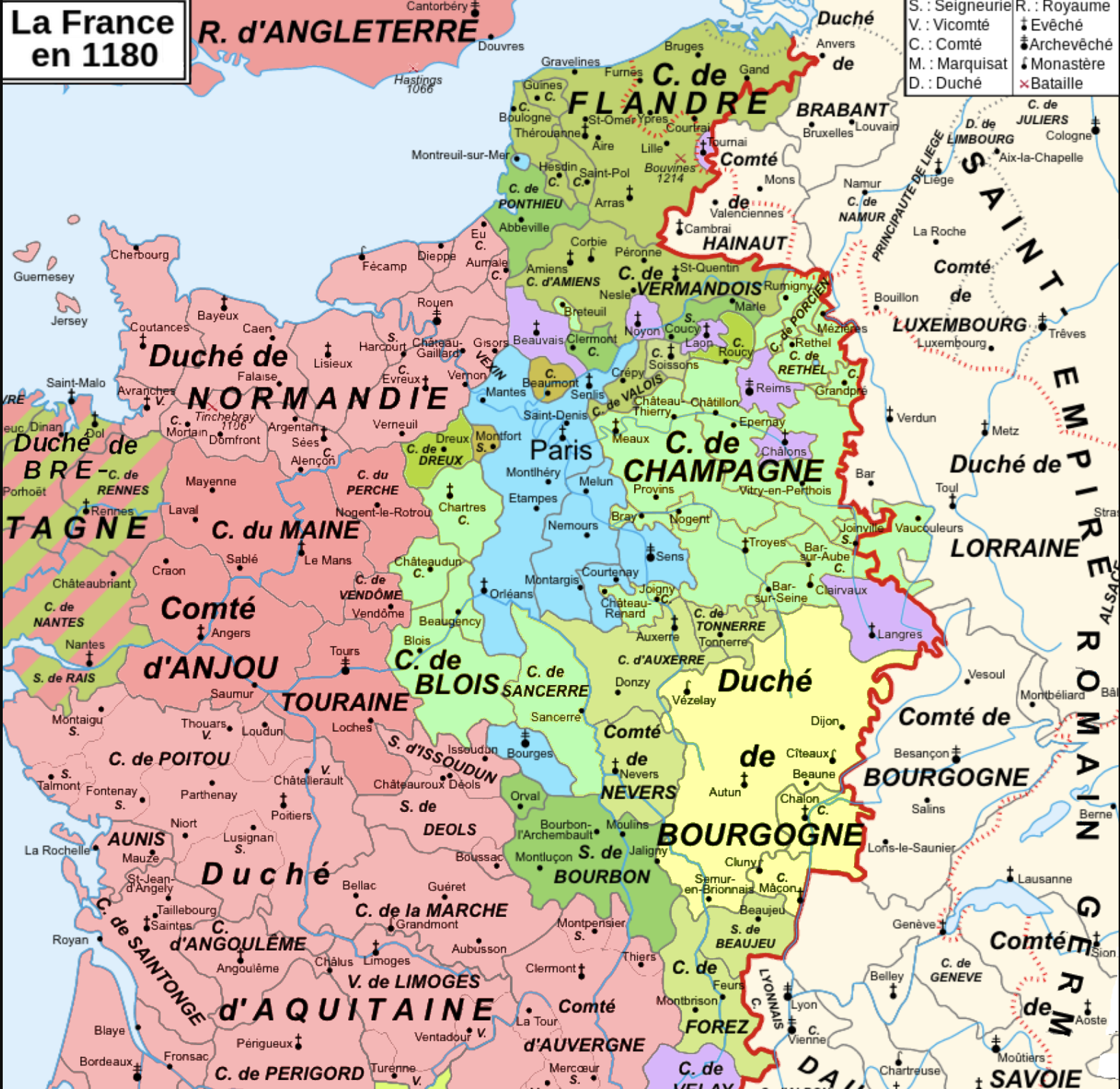 A map showing the various counties and duchies of France at the end of the 12th century.