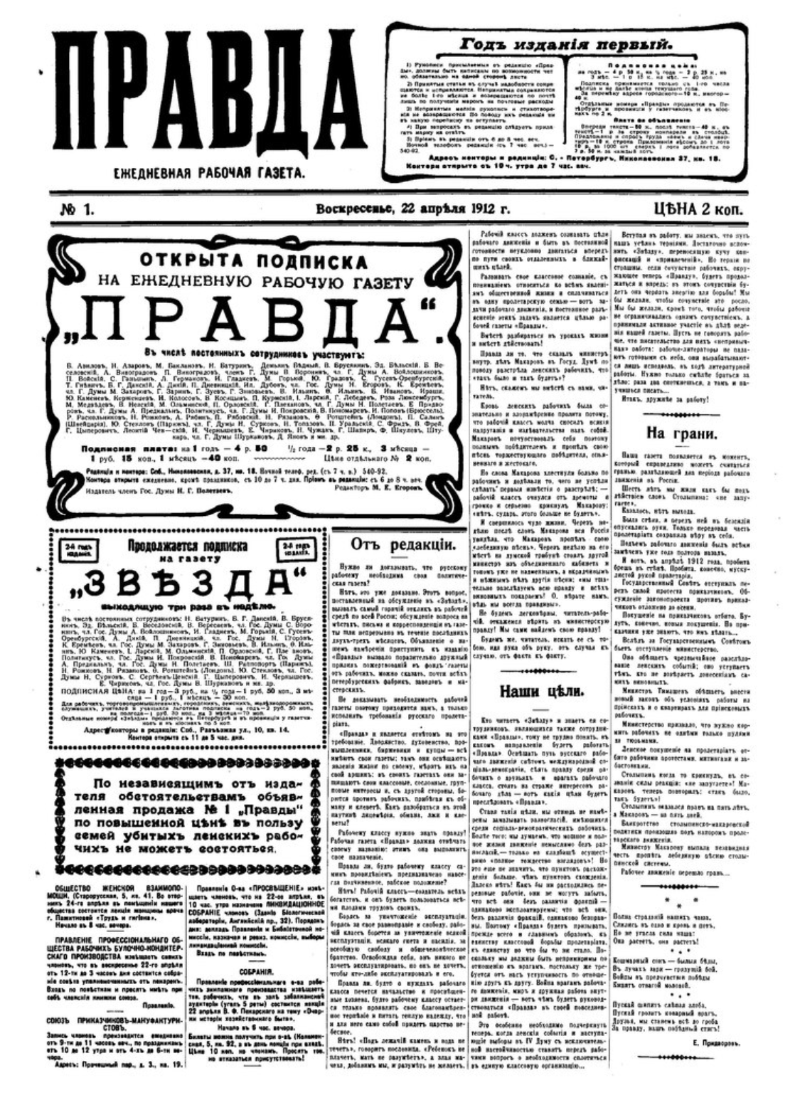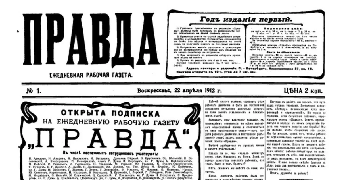 The first page of the first issue of the Russian political newspaper Pravda (May, 1912). Edited by socialists, the newspaper became the official mouthpiece of the Russian Bolshevik/Communist Party.
