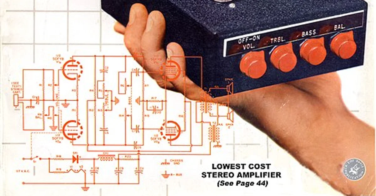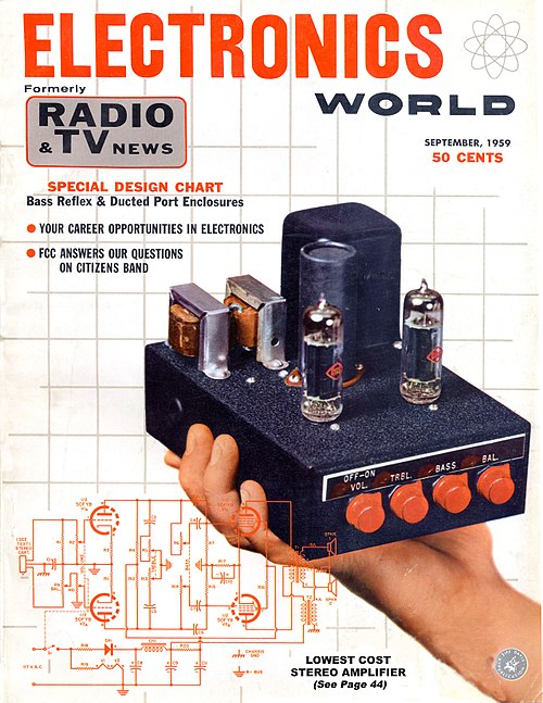 A home assembled amplifier featured as the cover illustration of the magazine Electronics World, September 1959, Volume 62 Number 3.