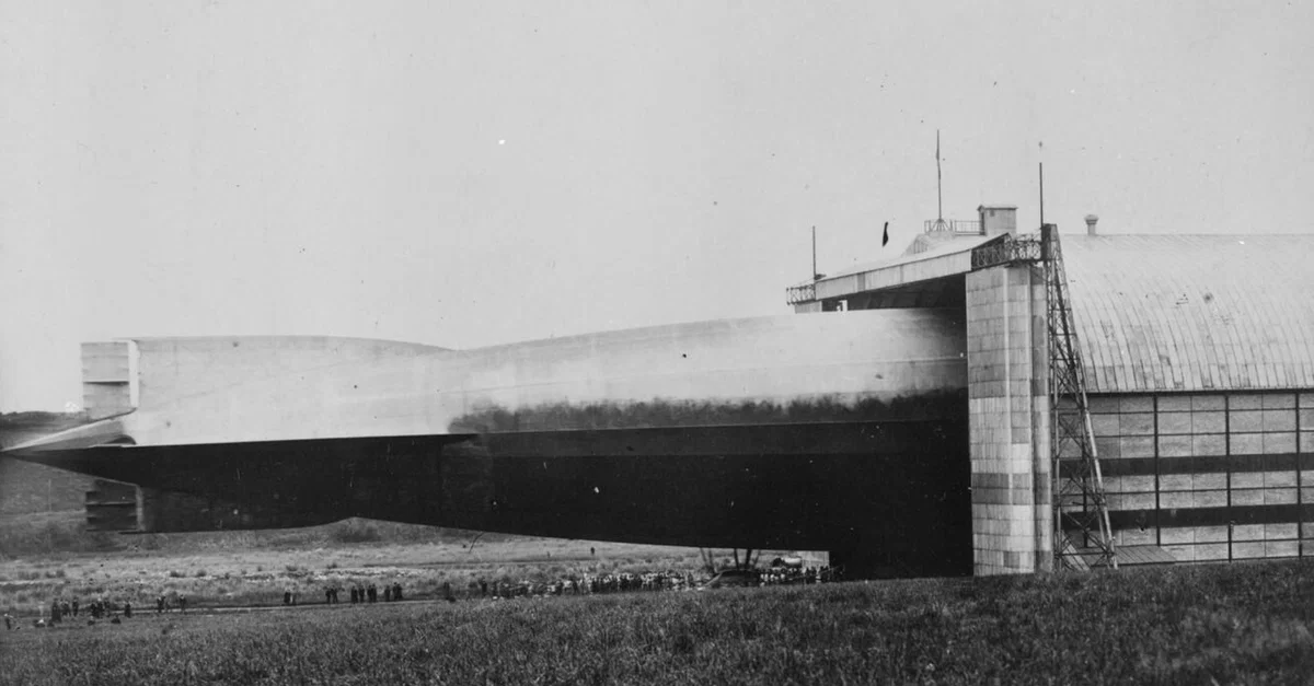 A Zeppelin airship entering its hangar, 1916.