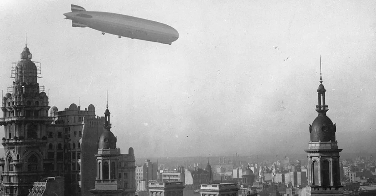 The Zeppelin airship LZ 127 Graf Zeppelin flying over the Barolo Palace of Buenos Aires, June 1934.