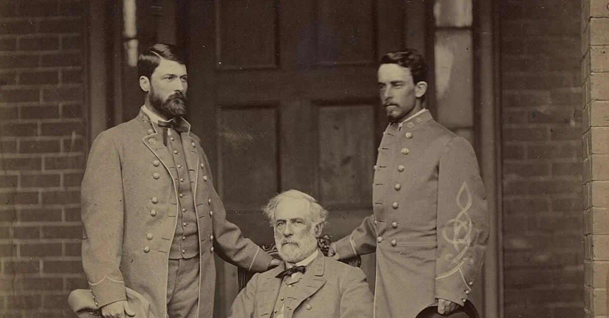 Robert E. Lee (center) with his son Custis Lee (left) and aide Walter H. Taylor (right), photograph by M. B. Brady & Co., April 1865.