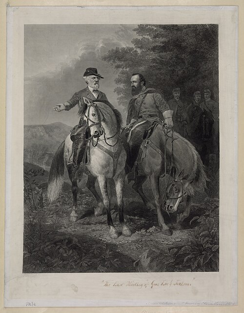Confederate generals Robert E. Lee and Stonewall Jackson meet for the last time prior to the Battle of Chancellorsville.