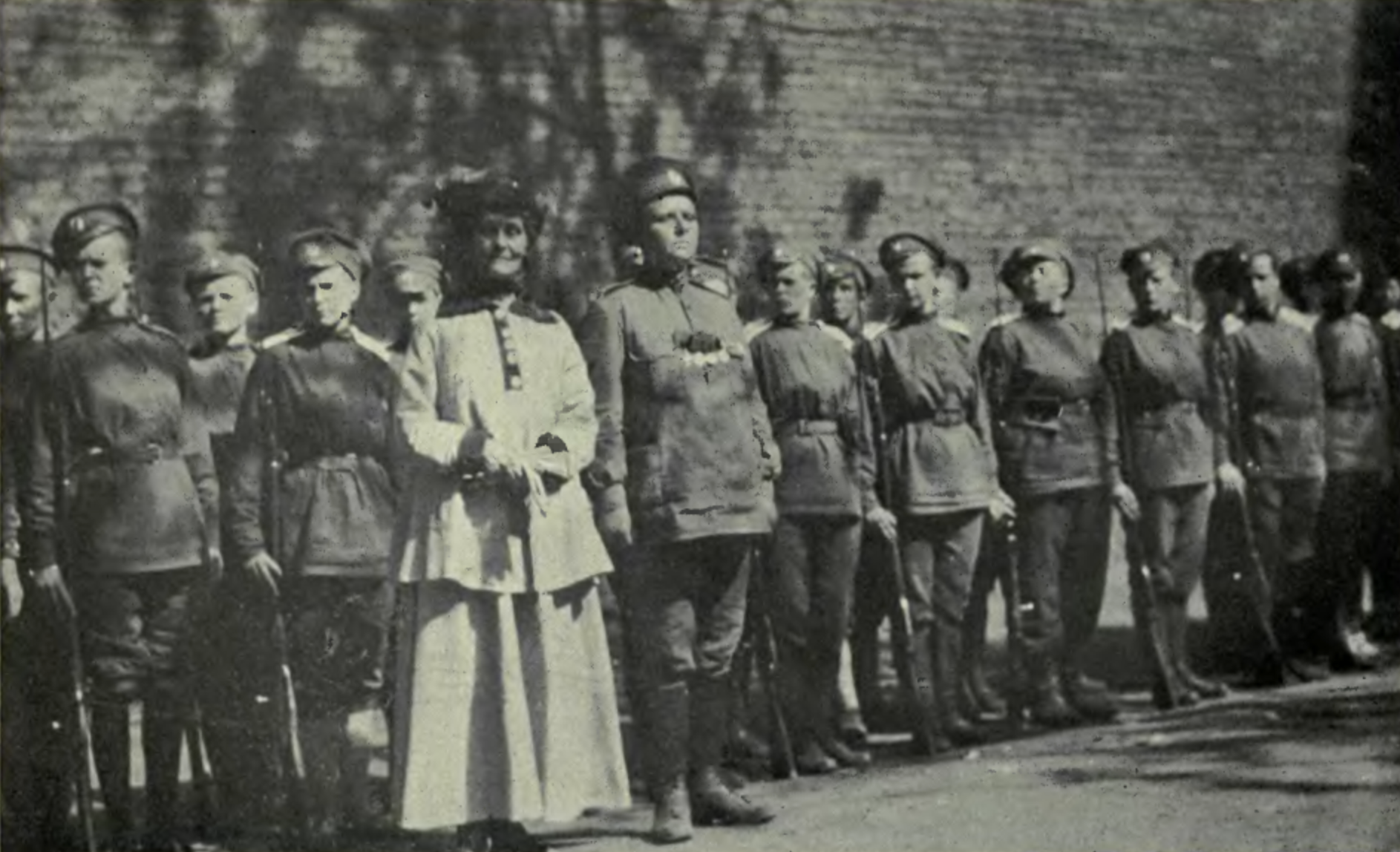 A 1917 photograph of the Russian Women’s Death Battalion and their leader Maria ‘Yashka’ Bochkareva (1889-1920), a Russian war hero. Also present is the British activist for women's rights Emmeline Pankhurst (1858-1928).