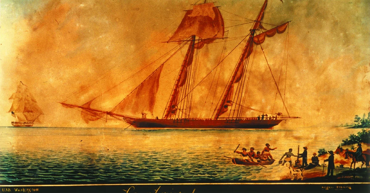 The sailing vessel La Amistad off Culloden Point, Long Island, New York, on 26 August 1839; on the left is the brig Washington of the US Navy - the ship that towed La Amistad to Connecticut. Watercolor by an unknown artist, 1840.