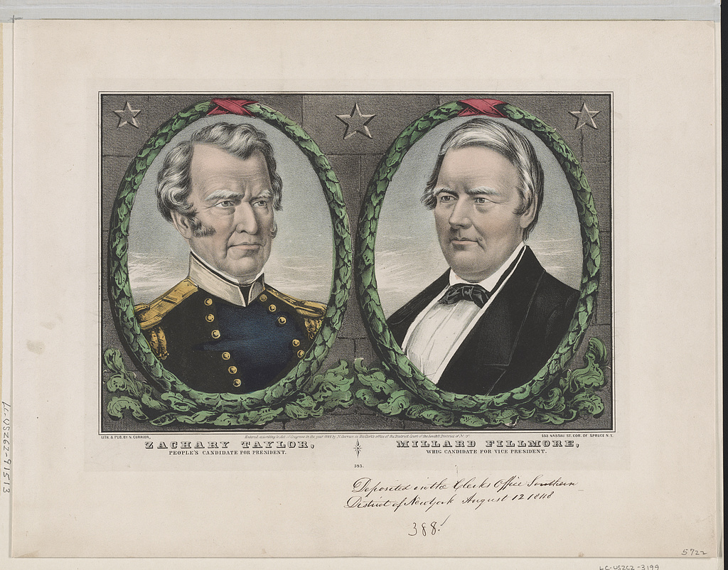 Campaign banner for Whig presidential and vice presidential nominees for 1848, Zachary Taylor and Millard Fillmore, lithograph and print by Nathaniel Currier, New York, c. 1848.