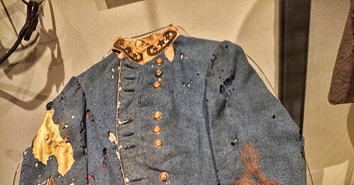 The tattered coat worn by Confederate Maj. Gen. Patrick Cleburne (1828-1864) when he was killed at the Battle of Franklin on 30 November 1864.