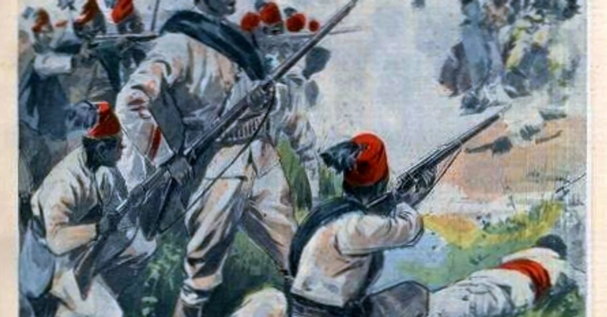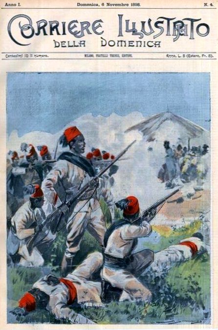 Frontpage of the Italian newspaper 'Corriere Illustrato della Domenica', depicting a group of Askaris, Italian colonial troops, in a battle against the Sultan of Raheita. ('The Rebellion of the Sultan of Raheita. The Victory of Our Ascari', 6 November 1898)