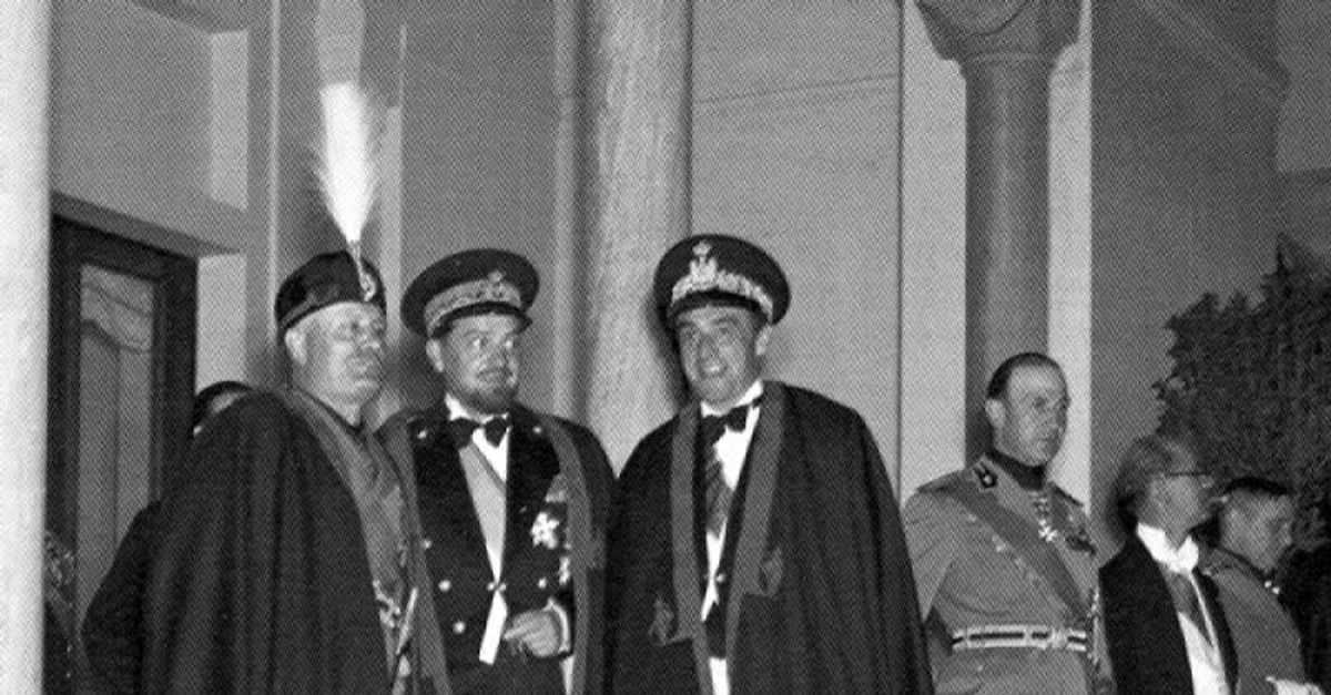 Italo Balbo (1896-1940) and Benito Mussolini (1883-1945) during a gala evening in Libya. The appointment of Balbo as governor of Libya was, in reality, a move to exile him over fear that his popularity in Italy could threaten Mussolini’s own grip on power.