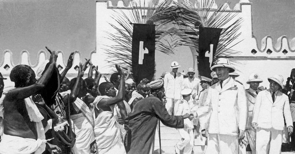 Italian Fascist Marshal Rodolfo Graziani (1882-1955) visiting Mogadishu as viceroy of Italian East Africa (18 February 1937). Rodolfo Graziani was one of the main perpetrators of the brutalities of Italian colonialism, due to his role in Libya (1921-1931), in the invasion of Ethiopia (1935-1936) and in the subsequent repression of the Ethiopian resistance.