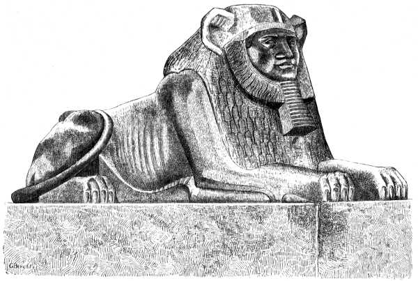 Sphinx in black granite; from Tanis. Drawn by G. Bénédite. From A History of Art in Ancient Egypt, Vol. II by Georges Perrot and Charles Chipiez (1883).