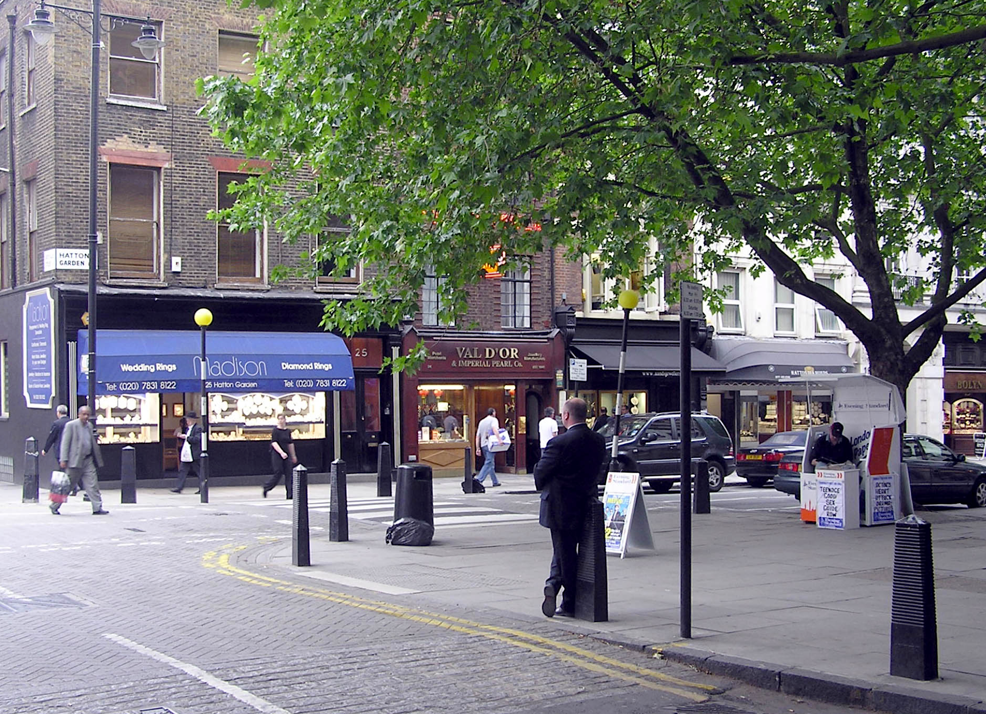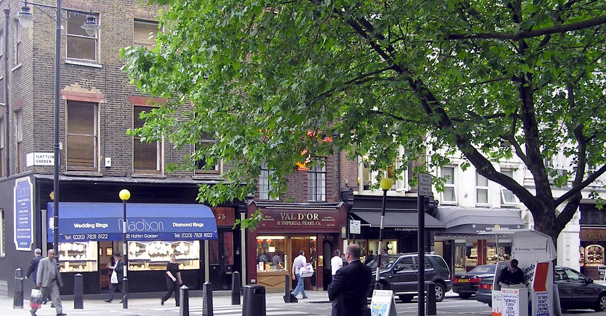 A photograph of London's Hatton Garden, an area which specialises in gold dealers and jewellery shops.