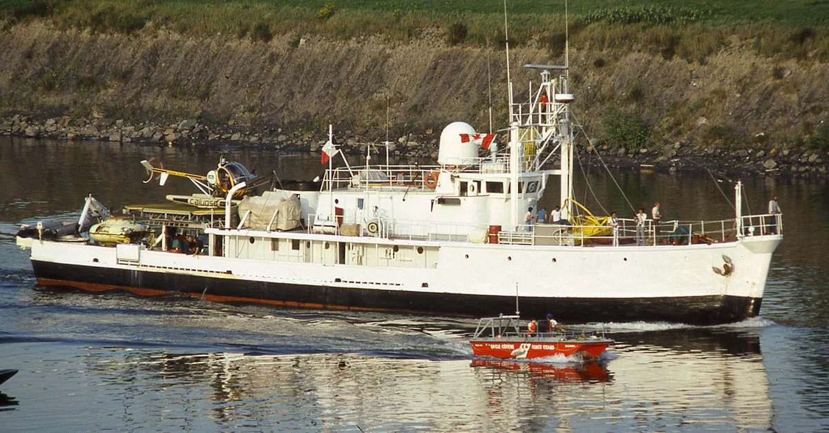 A photograph of the oceanographic research ship Calypso, used by Jacques-Yves Cousteau for various expeditions from 1951 until the mid-1990s. Taken in Montreal in 1980.