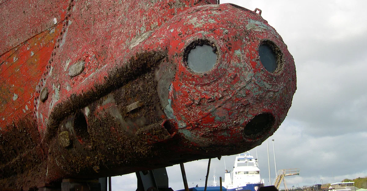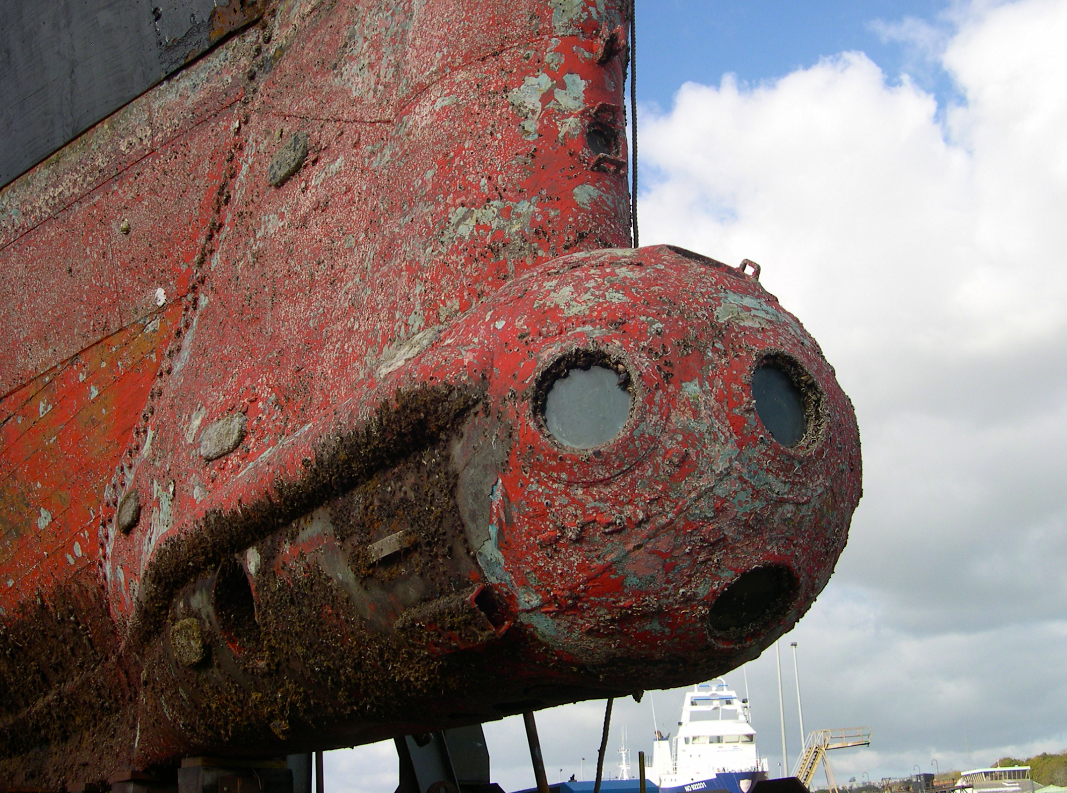 The false bow section with an underwater observation chamber of the oceanographic research ship Calypso, used by Jacques-Yves Cousteau for various expeditions from 1951 until the mid-1990s.