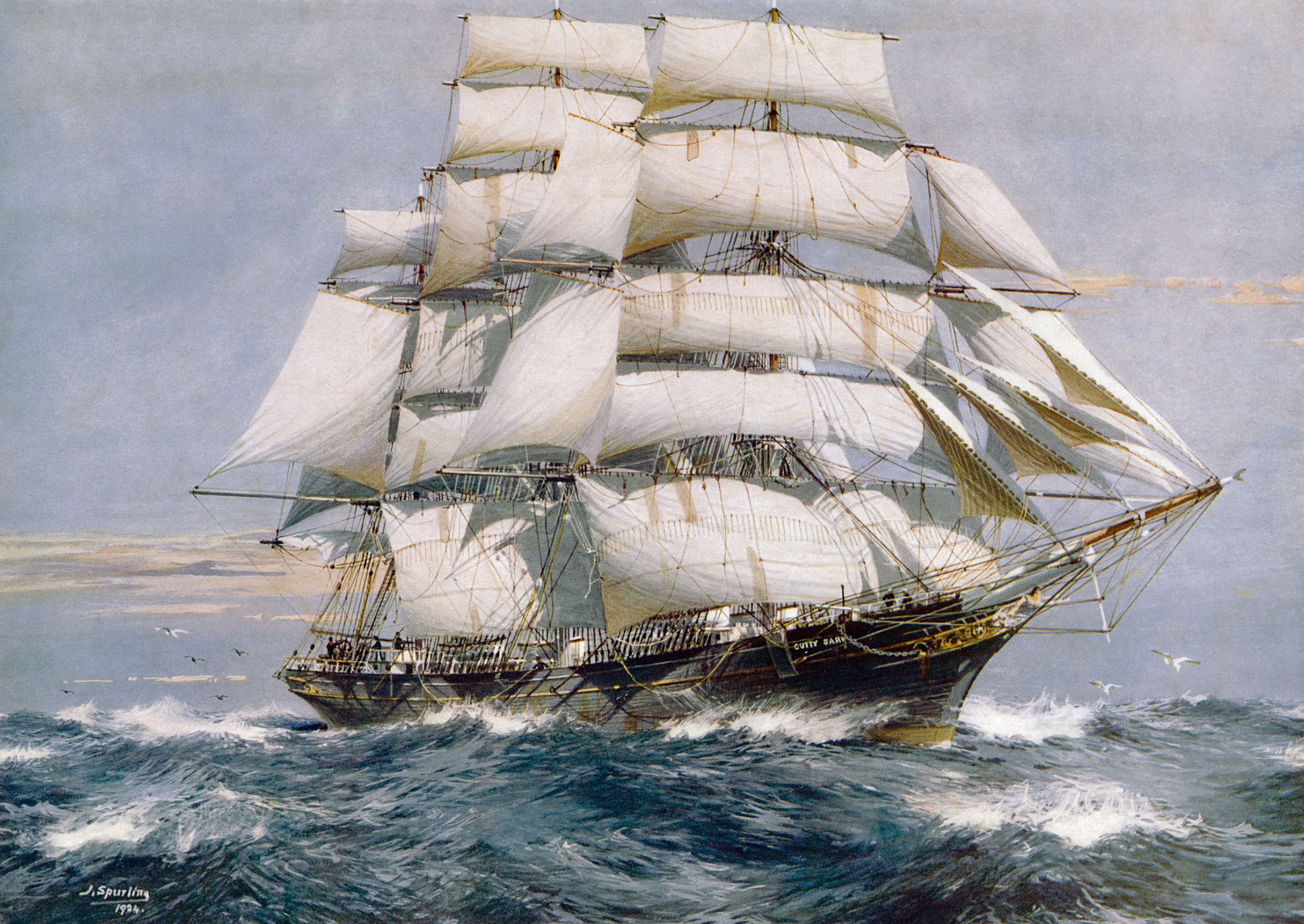 A 1924 painting of the famous British tea clipper Cutty Sark by Jack Spurling.