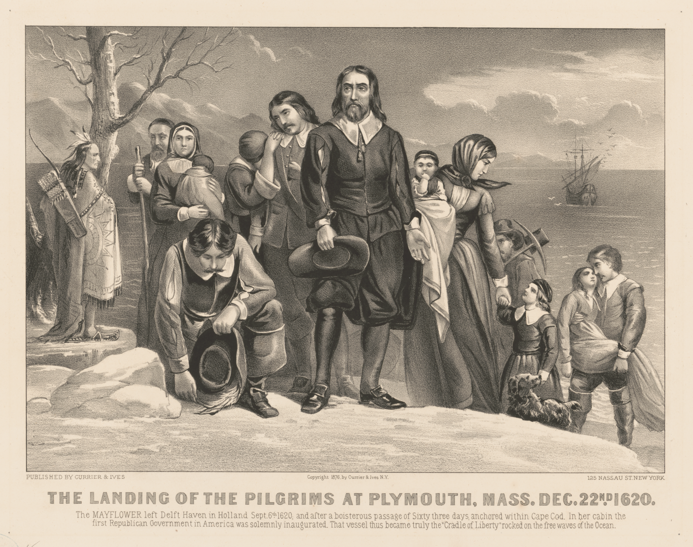 The Landing of the Pilgrims at Plymouth, Mass. Dec. 22nd 1620, lithographic print by Currier & Ives, 1876. Based on the original painting by Lucy Charles, c. 1850.
