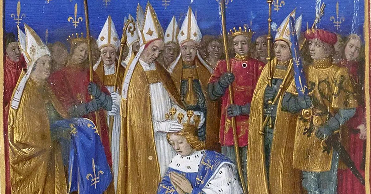 The coronation of Charles VI of France, illumination on parchment by Jean Fouquet, in Grandes Chroniques de France, c. 1455-1460.