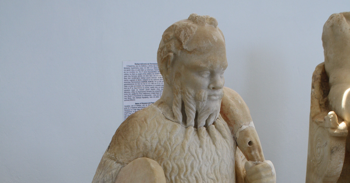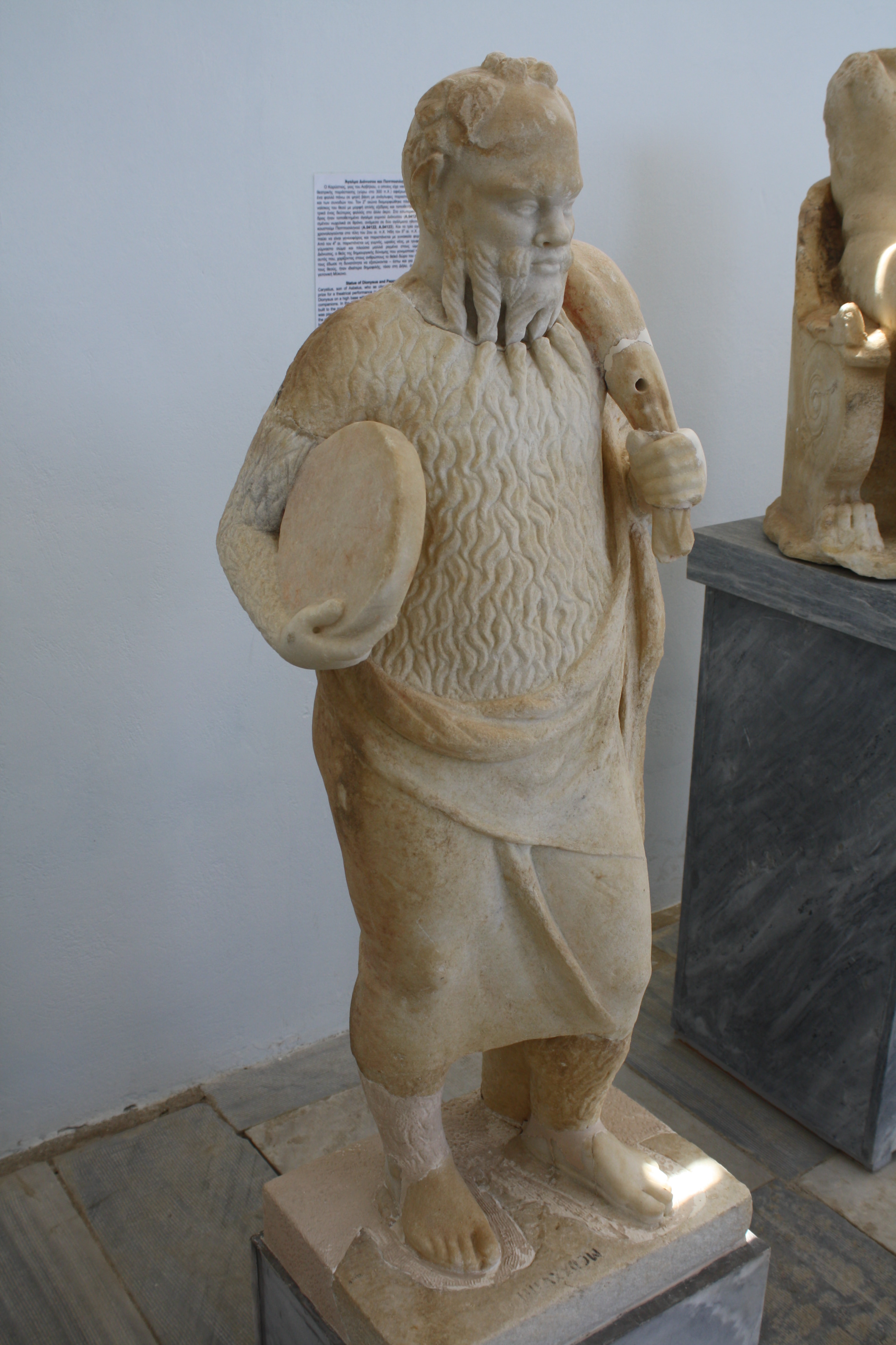 A statue of a comic actor in the costume of Old Silenus, a companion and teacher of Dionysos, the god of wine. He holds a drum and has an empty wine skin over his shoulder. 2nd-1st century BCE, Delos. (Site Museum, Delos)