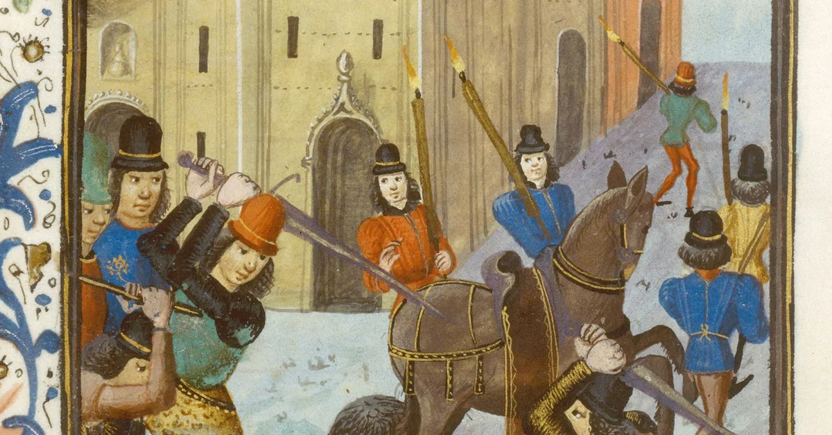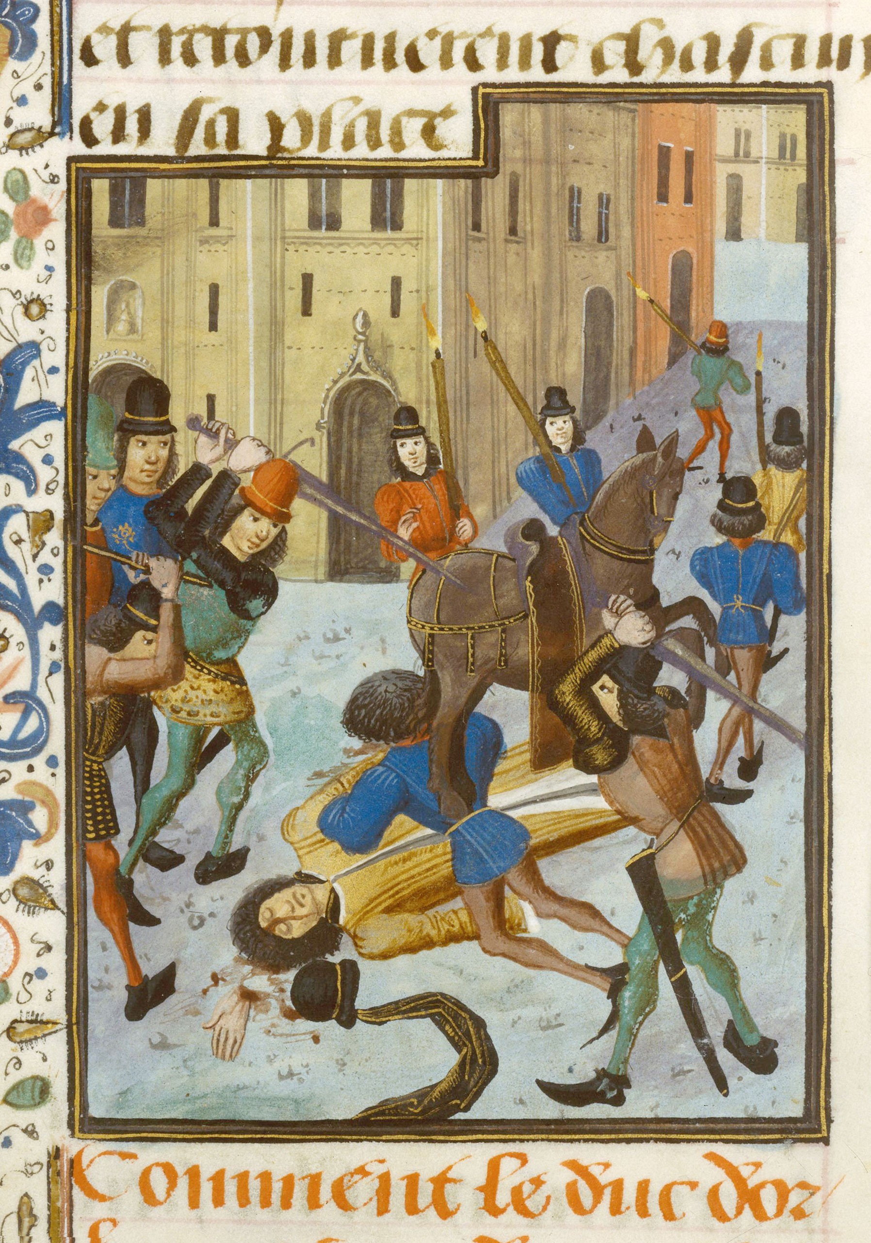 Murder of the Duke of Orléans, illumination on parchment by the Master of the Vienna Chroniques d'Angleterre, included in Enguerrand de Monstrelet's Chronique, folio 52, Bruges, c. 1470-1480.