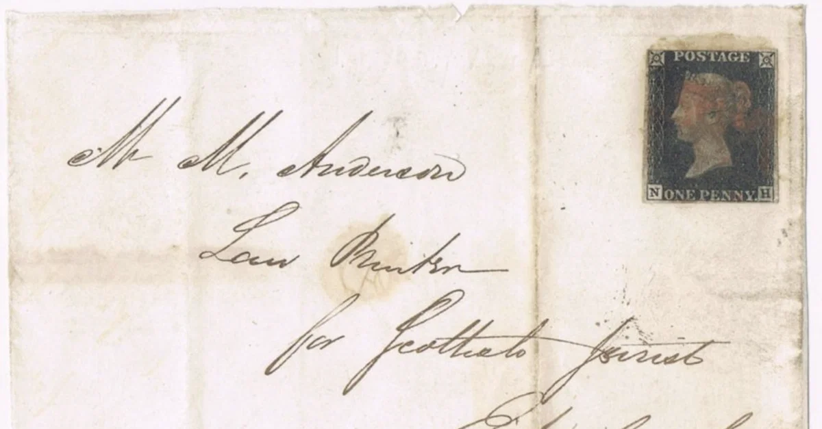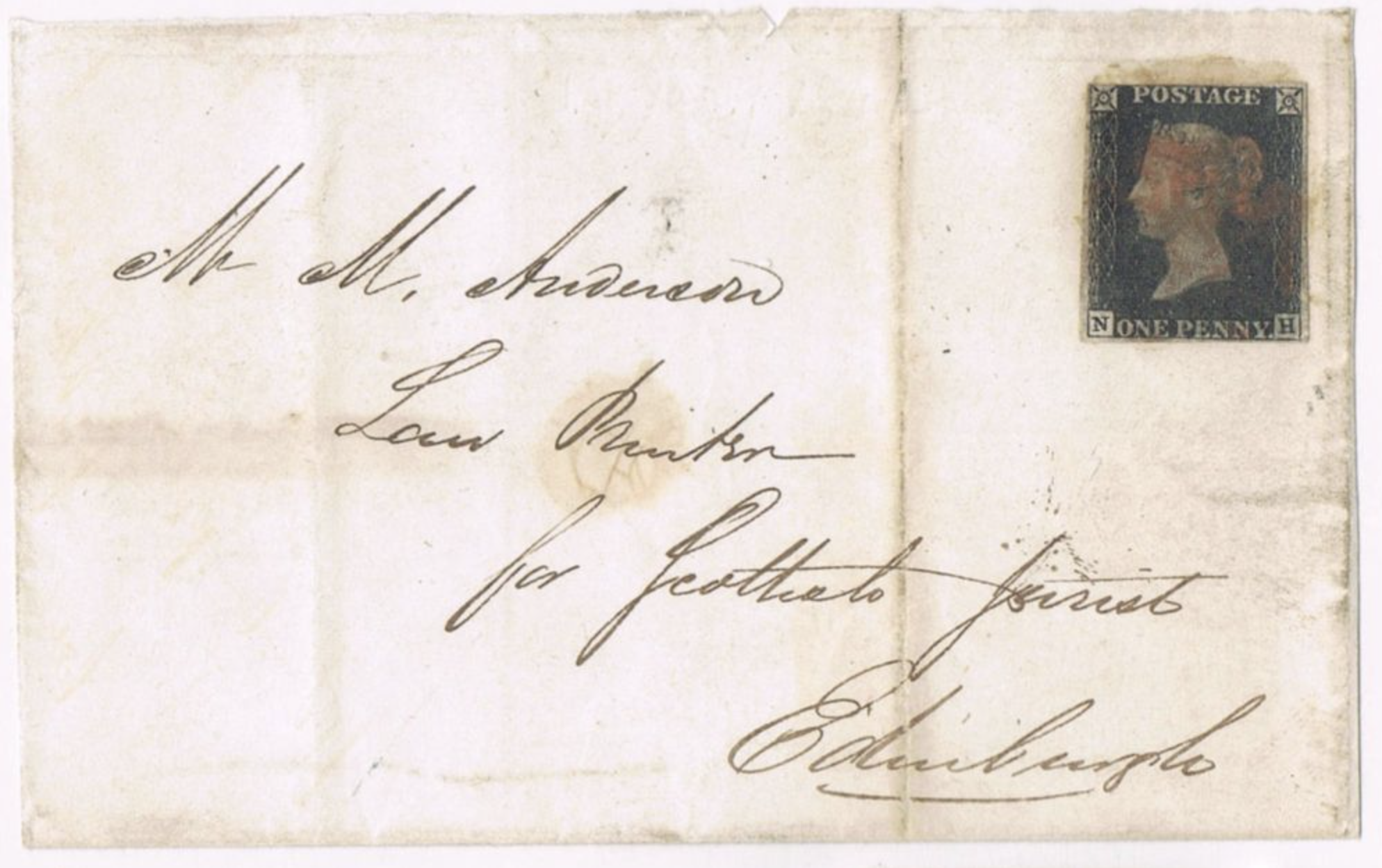 An envelope with a Penny Black stamp attached. The first postage stamp, the Penny Black was introduced in Britain in May 1840.