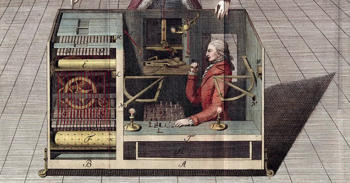 The Mechanical Turk, illustration in Joseph Friedrich von Racknitz's pamphlet On Mr. von Kempelen's Chess Player and its Replica, 1789.