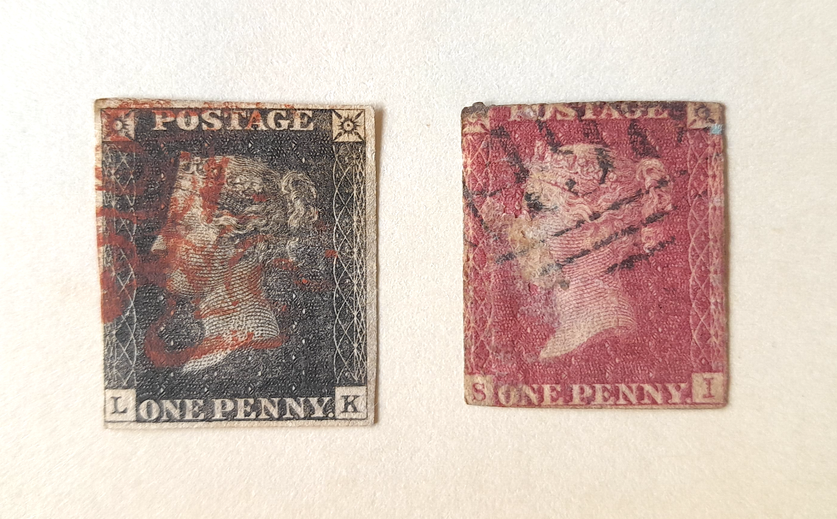 Two British postage stamps bearing the portrait of Queen Victoria (reign 1837-1901). The Penny Black was the world's first postage stamp and issued from May 1840. As it was difficult to see an obliteration stamp (postmark) against a black background, the Penny Red was introduced from February 1841. (Private Collection)