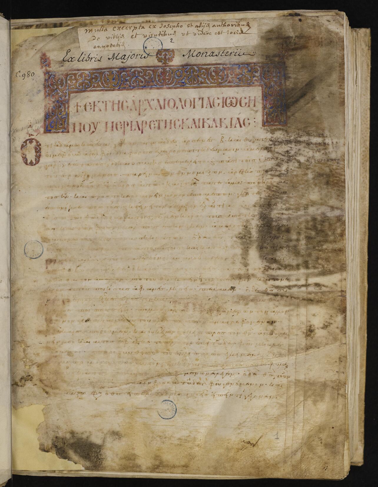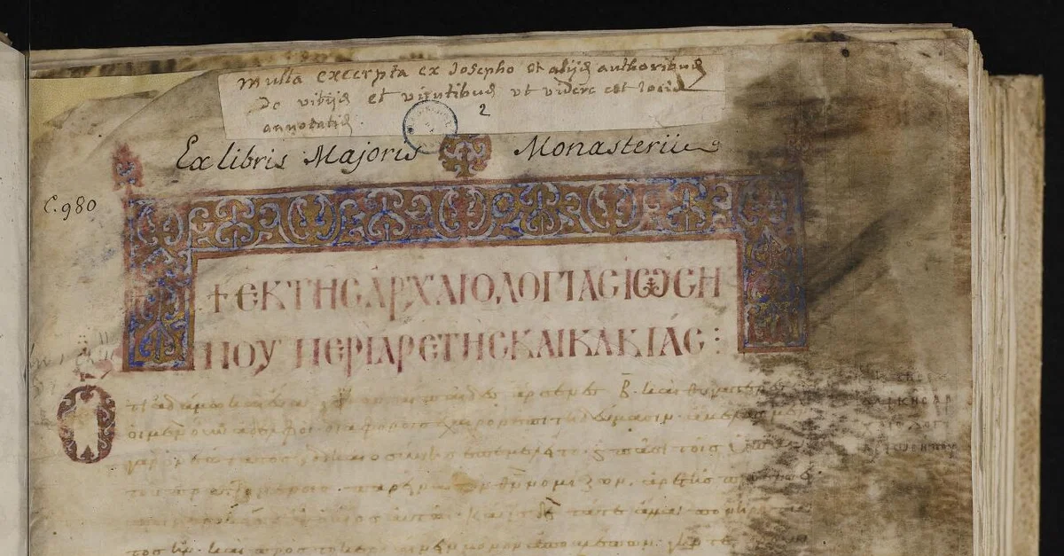 This is the first folio of the manuscripts of the Excerpta de Virtutibus et Vitiis, stored in Tours, France. It is part of the Constantinian Excerpts, a Byzantine encyclopedia compiled in the 10th century. The capital letter shows the title and which historian it was citing, and the minuscule letter was used for the main texts, with each paragraph seperated by the enlarged Omicron. The capital letter and the minuscule letter were used to create a visual hierachy, suggesting the purpose of this deluxe manuscript was not just for reading but also for creating an impressive book aesthetic. (Tours Municipal Library)